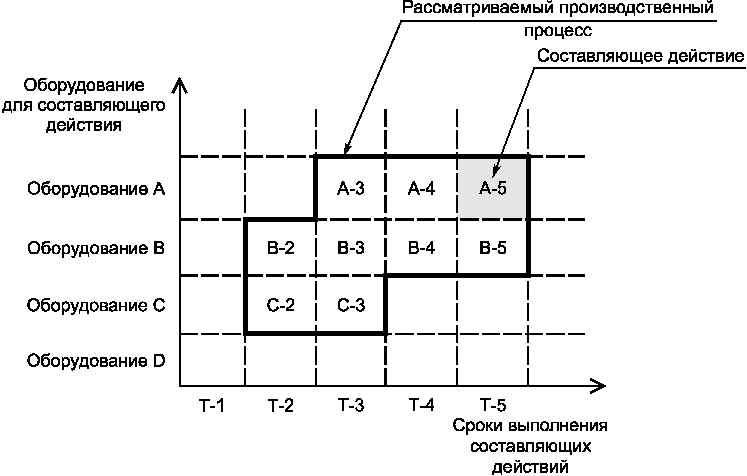 Пример - Как показано на рисунке 3, в соответствии со спецификацией оценки экологической эффективности составляющее действие на оборудовании A рассматривается с учетом сроков его выполнения T3, T4 и T5. Составляющее действие на оборудовании C рассматривается с учетом сроков его выполнения T2 и T3. Из рисунка 3 видно, что рассматриваемые составляющие действия идентифицируются блоками (от блока A-3 до блока C-3) схемы, определяющей комбинации реализаций конкретных единиц оборудования и конкретных сроков выполнения указанных действий.