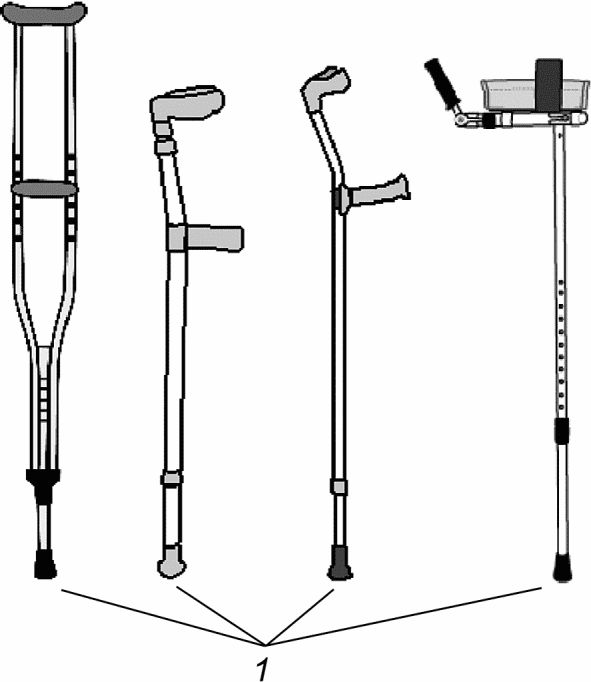 Костыли включают в себя следующее: локтевые костыли, костыли с подлокотниками и подмышечные костыли, описанные в ИСО 9999.