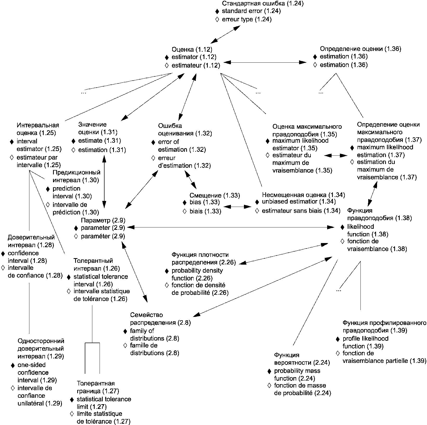 Примечание 1 - Оценкой может быть выборочное среднее (1.15) при определении оценки математического ожидания (2.35) генеральной совокупности, которое может быть обозначено Примечание 2 - При определении оценок характеристик генеральной совокупности [например, моды (2.27) для одномерного распределения (2.16)] подходящей оценкой может быть функция оценки(ок) параметра распределения или сложная функция случайной выборки (1.6). Примечание 3 - Термин "оценка" использован в широком смысле. Он включает в себя как точечную, так и интервальную оценки параметра, которые могут быть использованы для прогнозирования (иногда их рассматривают как прогностические факторы). Оценка также может включать в себя такие функции, как ядерные оценки и другие специальные статистики. Дополнительная информация приведена в примечаниях к 1.36. | en | estimator | ||||||||||||||