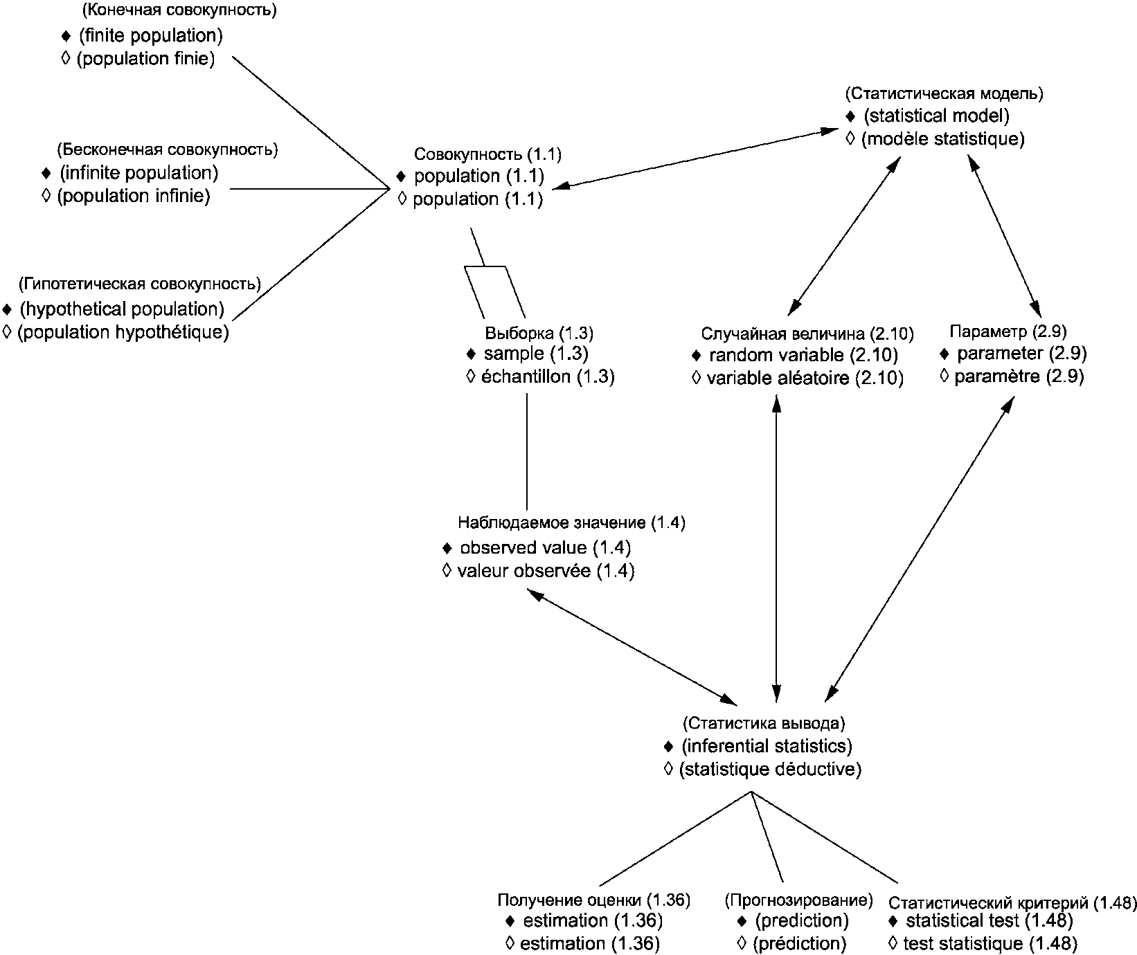 Примечание 1 - Совокупность может состоять из реальных объектов и быть конечной, может состоять из реальных объектов и быть бесконечной или может быть полностью гипотетической. Иногда используют термин "конечная совокупность", особенно в ситуациях, связанных с получением конечных выборок. Подобным образом термин "бесконечная совокупность" используют в случае выборки из континуума. В главе 2 совокупность рассматривается в вероятностном контексте как пространство элементарных событий (2.1). Примечание 2 - Гипотетическая совокупность позволяет делать различные предположения о природе ожидаемых данных. Таким образом, гипотетическая совокупность полезна на стадии статистических исследований, особенно при выборе подходящего объема выборки. Гипотетическая совокупность может состоять из конечного или бесконечного числа элементов. Ее использование особенно полезно при работе с аналитическими статистиками в статистических исследованиях. Примечание 3 - Область применения исследований определяет свойства совокупности. Например, если для демографического или медицинского исследования выбраны три населенных пункта, то генеральная совокупность состоит из жителей данных конкретных населенных пунктов. Однако если эти три населенных пункта выбраны случайным образом среди всех населенных пунктов заданного региона, то совокупность состоит из всех жителей данного региона. | en | population | ||||||||||||||