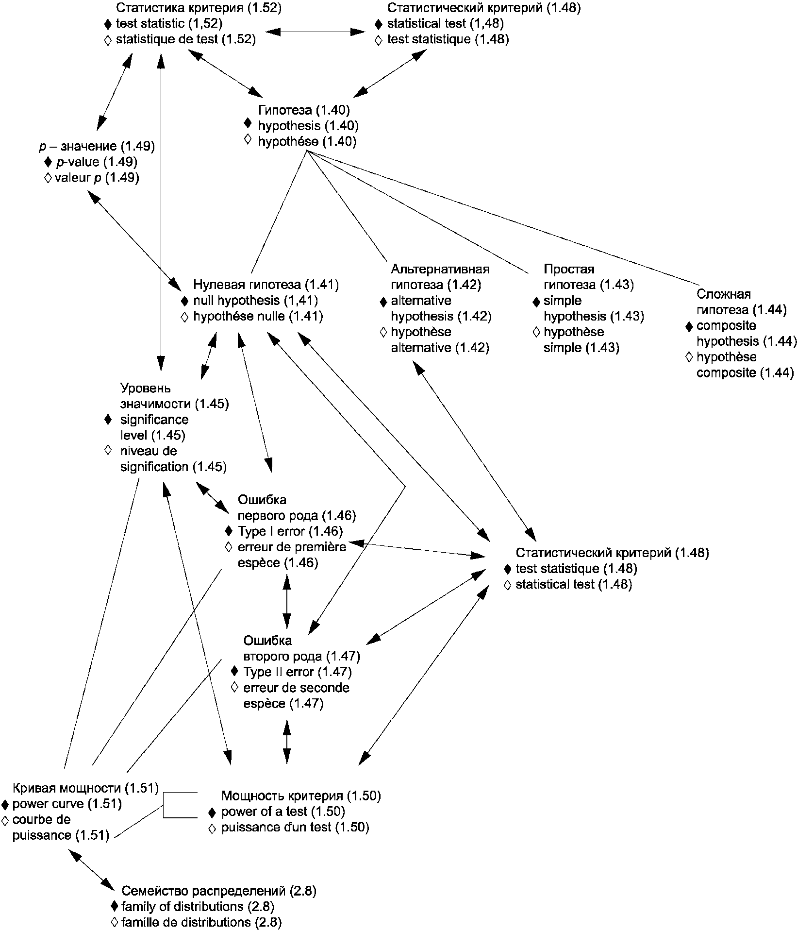 1.44 сложная гипотеза: Гипотеза, задающая более одного распределения (2.11) из семейства распределений (2.8). Пример 1 - Нулевая гипотеза (1.41) и альтернативная гипотеза (1.42), представленные в примерах 1.41 и 1.42, являются примерами сложных гипотез. Пример 2 - В примере 3 к 1.48 (случай 3) нулевая гипотеза является простой гипотезой. В примере 4 к 1.48 нулевая гипотеза также является простой гипотезой. Остальные гипотезы, представленные в 1.48, являются сложными. | en | composite hypothesis | ||||||||||||||