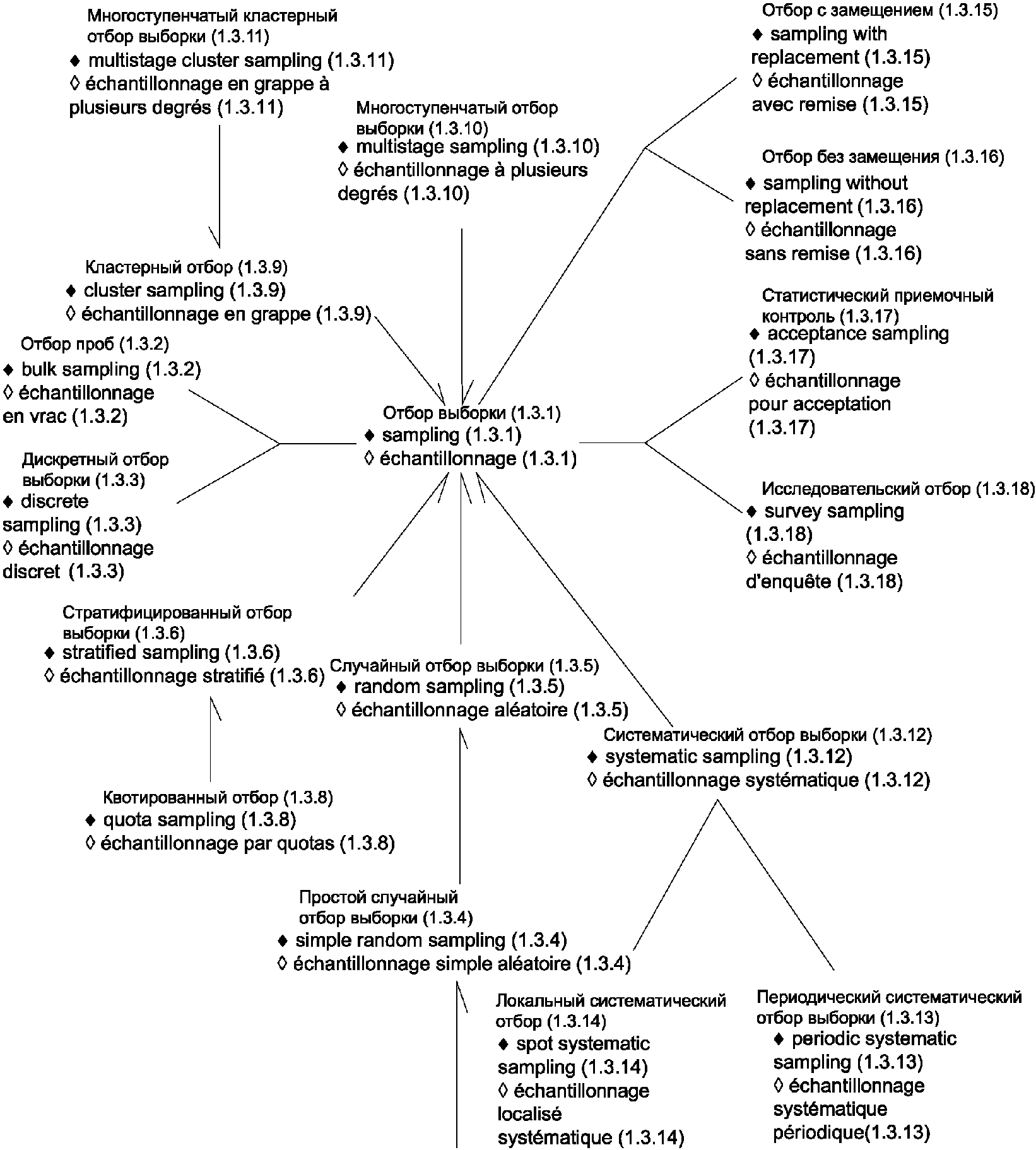 1.3.10 многоступенчатый отбор выборки: Отбор выборки (1.3.1), при котором выборку (1.2.17) отбирают поэтапно, и выборочные единицы (1.2.14), отобранные на каждом этапе, отбирают из большого количества единиц, отобранных на предыдущем этапе. Примечание 1 - Многоступенчатый отбор отличается от сложного отбора. Сложный отбор - это отбор выборки одновременно по нескольким критериям. | en | multistage sampling |