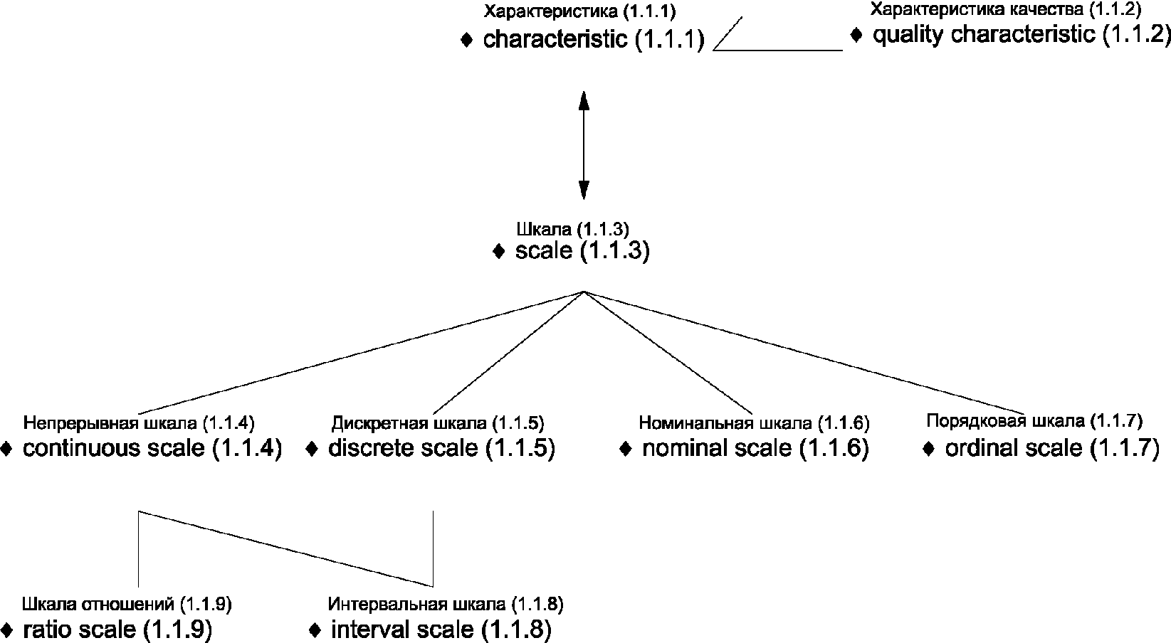 1.1.3 шкала: Система базовых значений характеристики (1.1.1). Примечание 1 - Термин "значение" использован в широком смысле, включая качественные характеристики. Примечание 2 - В "качественном смысле" шкала имеет символические указатели дифференциации. | en | scale |