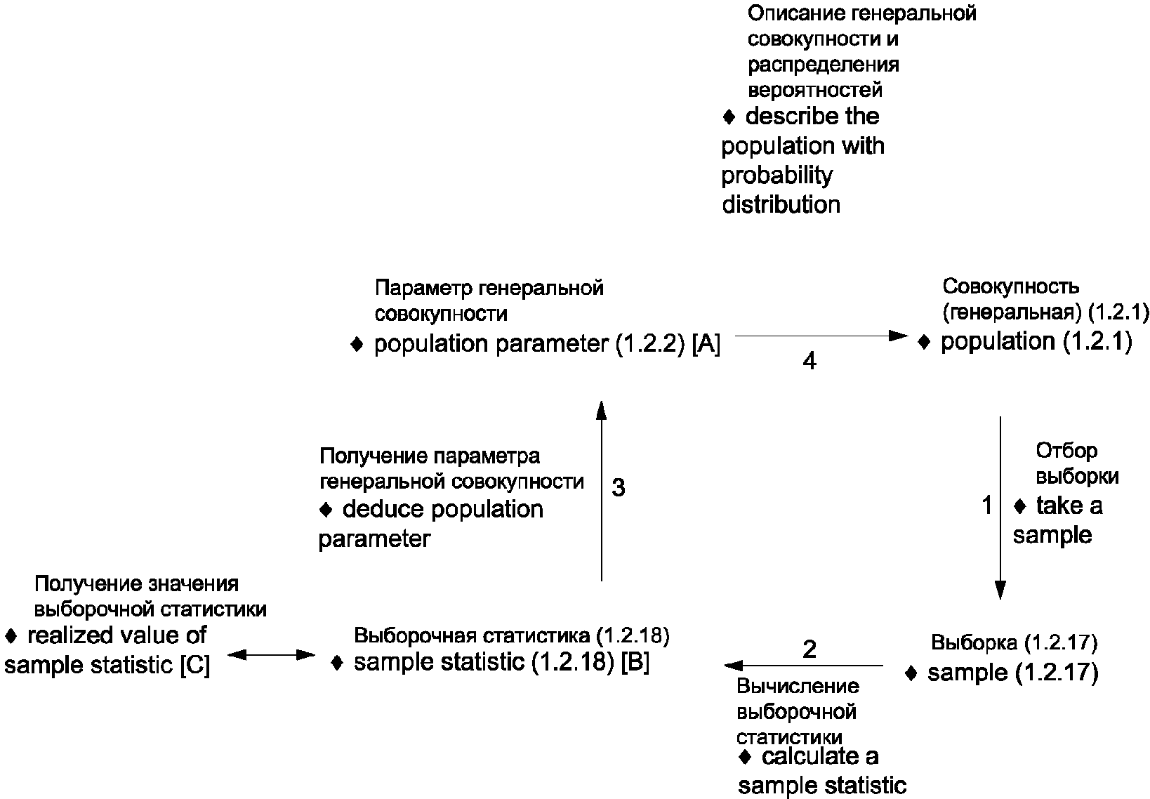 1.2.1 совокупность (генеральная): Множество всех рассматриваемых единиц (1.2.11). Примечание 1 - Генеральная совокупность может состоять из реальных объектов и быть конечной, может состоять из реальных объектов и быть бесконечной или может быть полностью гипотетической. Примечание 2 - Продолжительный отбор выборки (1.3.1) из конечной генеральной совокупности, состоящей из реальных объектов, может привести к изменению фактических относительных частот или частотных распределений (2.5.1). Наоборот, исходя из этого, на основе этих распределений может быть выведена теоретическая модель гипотетической генеральной совокупности. Это дает возможность прогнозирования. Примечание 3 - Генеральная совокупность может охватывать результаты происходящего в настоящее время процесса и включать будущие результаты. Примечание 4 - Генеральная совокупность может состоять из отдельных объектов или нештучного материала. | en | population |