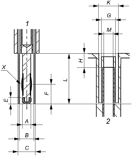 1 - штекерный ВЫВОД; 2 - гнездовой ВЫВОД; X - точка,