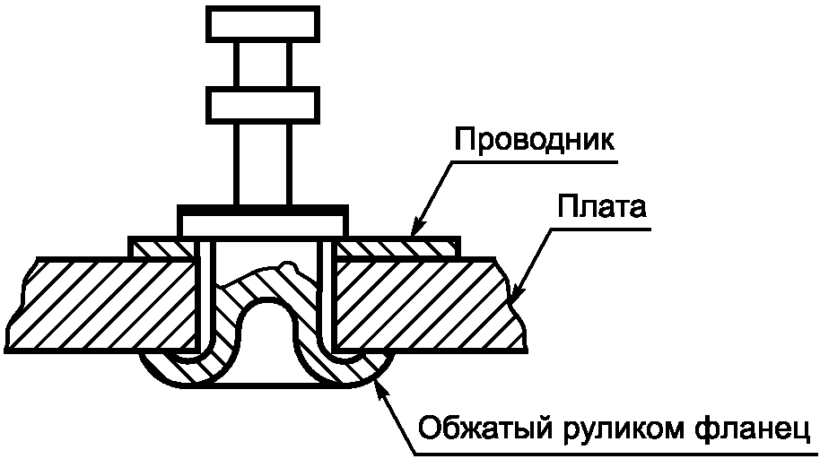 Развальцованный фланец клеммы не должен быть перфорированным, расколотым, треснутым или иным образом прерывистым до такой степени, что флюс, масла, чернила или другие вещества, используемые для обработки печатной платы, смогут проникнуть. После развальцовки фланец должен соответствовать