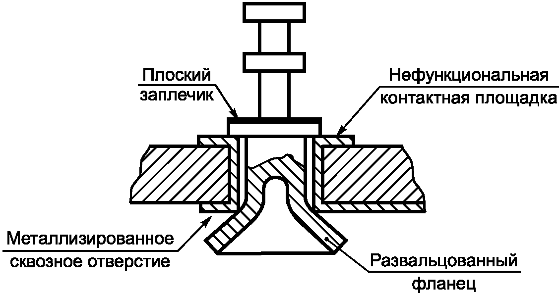 Развальцованные фланцы контактов должны устанавливаться в металлизированные сквозные отверстия, не предназначенные для межслойных соединений, при условии, что монтаж осуществляется в соединении с контактной площадкой или земляным слоем на развальцованной стороне контакта, как показано на