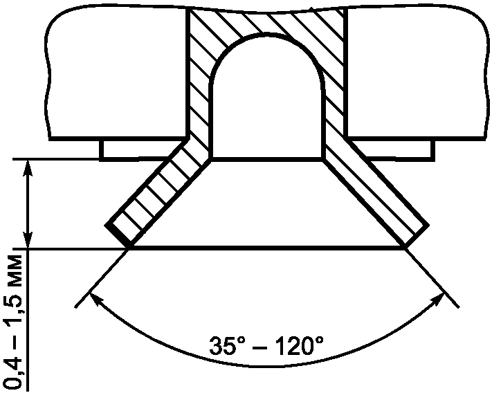 Развальцованные фланцы должны формоваться с углом 35° - 120° и должны выступать на расстояние 0,4 - 1,5 мм над поверхностью контактной площадки при условии, что обеспечиваются требования к минимальному электрическому зазору (см.
