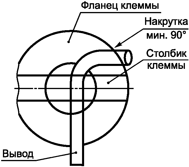Для конструкций, утвержденных потребителем, которые включают в себя провешивание/сцепление проводов. Провод(а), прикрепленные к перфорированным контактам, должны соприкасаться по меньшей мере с двумя (смежными или несмежными) поверхностями контакта. Намотка провода должна состоять минимум из 1/4 поворота и максимум из 3/4 поворота. Концы вывода или провода могут заходить за контакт максимум на один диаметр вывода (см.