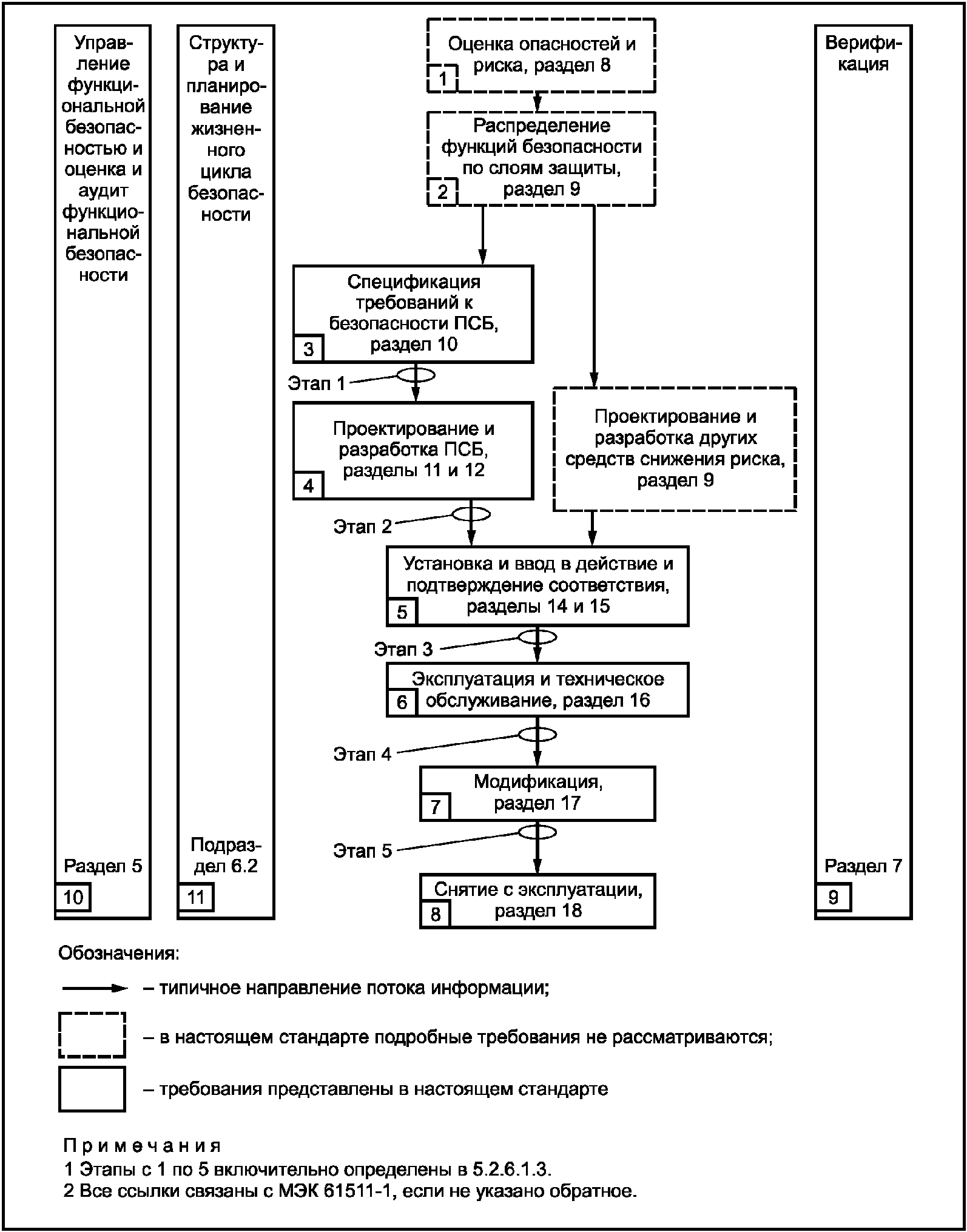 В основе комплекса стандартов МЭК 61511 лежат две фундаментальные концепции, необходимые для его применения: концепция жизненного цикла ПСБ и концепция уровней полноты безопасности (УПБ). Жизненный цикл ПСБ формирует базовую структуру, объединяющую большинство положений настоящего стандарта.