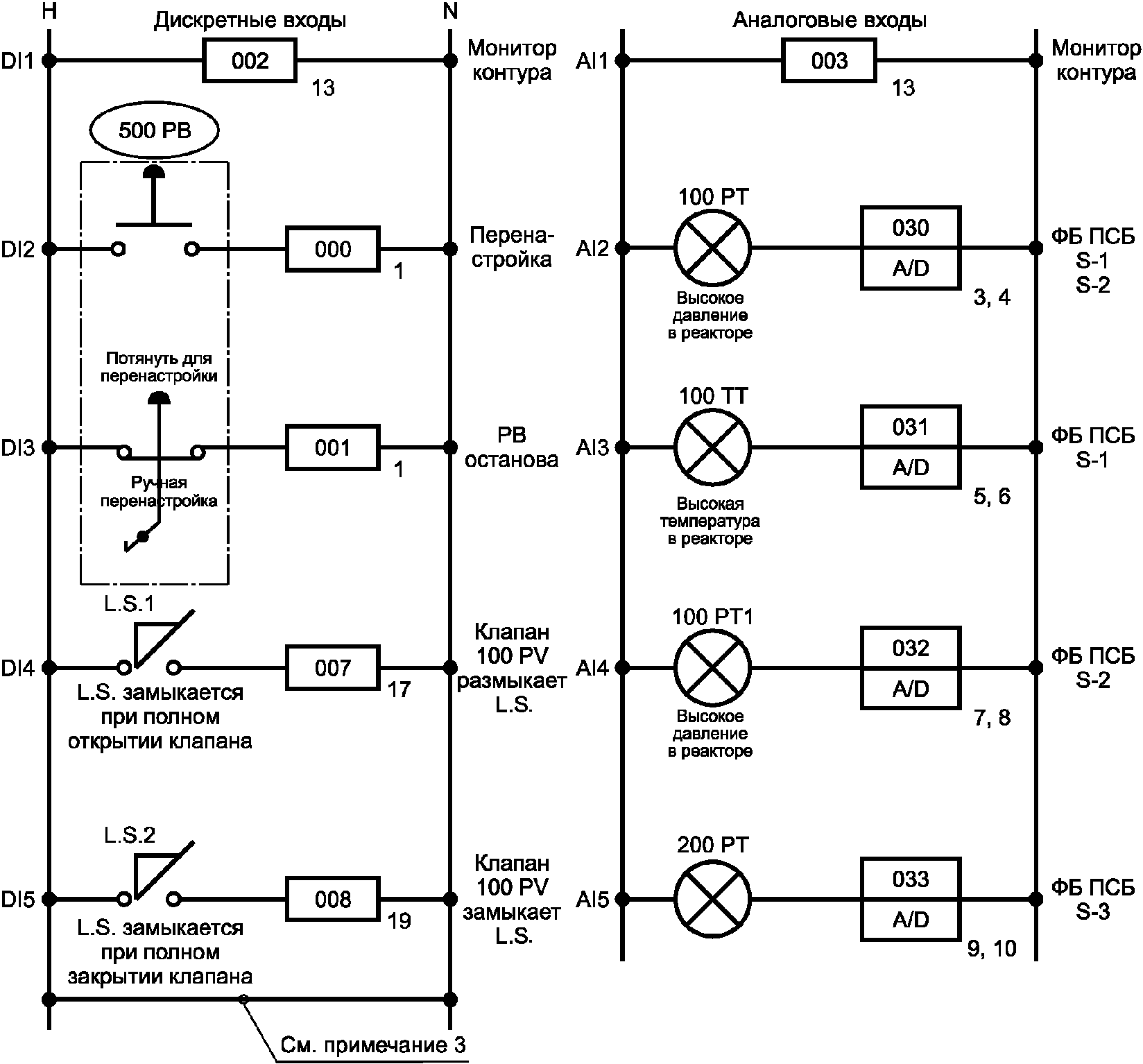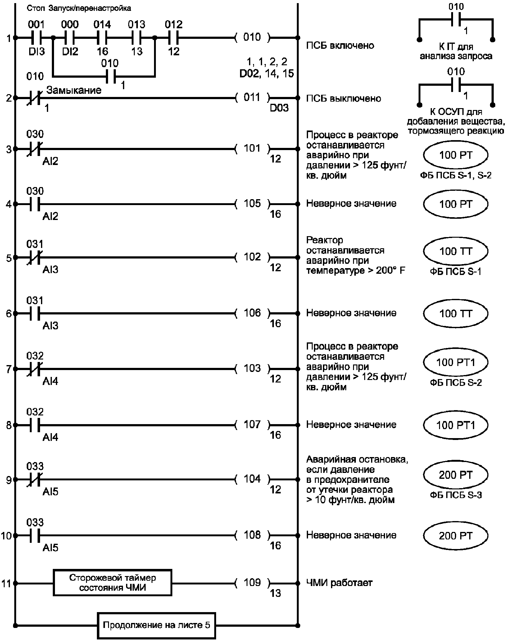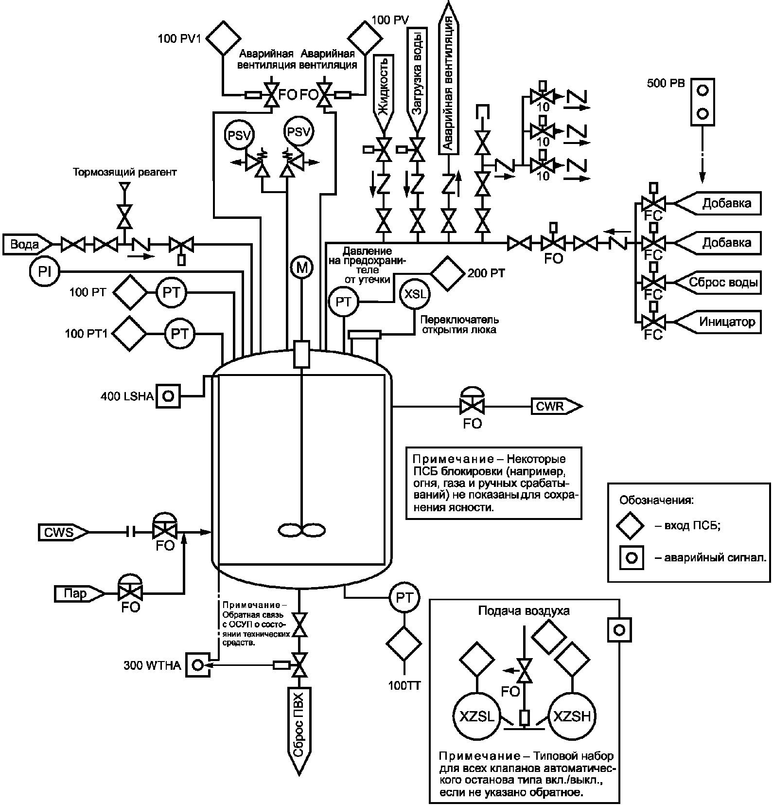 A.3.2.67 функция безопасности ПСБ (safety instrumented function): Функции безопасности ПСБ (ФБ ПСБ) формируются из определенной функции безопасности, имеют соответствующий уровень полноты безопасности (УПБ) и выполняются конкретной приборной системой безопасности (ПСБ), например "закрыть клапан #XY123 в течение 5 с, если давление в емкости #ABC456 достигнет 100 бар". Устройства ПСБ могут быть использованы более чем в одной ПСБ.
