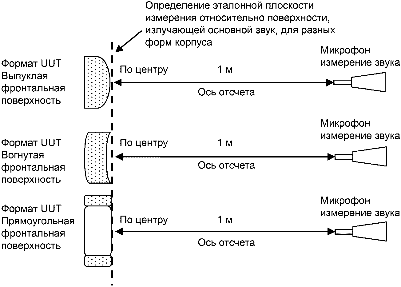 A.3 приведены возможные конфигурации и размещение измерителя уровня звука для различных форм UUT.