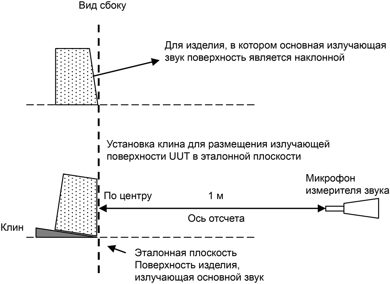 Возможное размещение при испытании громкоговорителя UUT и измерителя уровня звука показано на