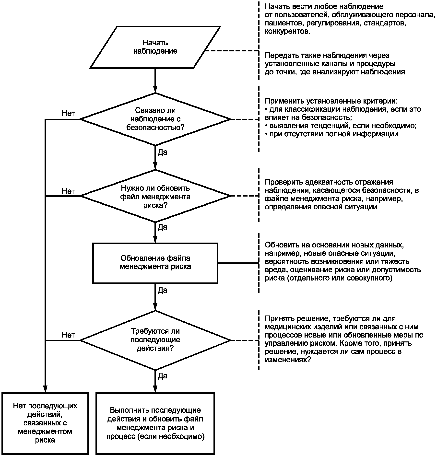 Как правило, первоначальная оценка риска основана на опыте работы с аналогичными медицинскими изделиями, или принадлежностями на рынке, или на предположениях, когда новые медицинские изделия выпускают на рынок. Информация, полученная после выпуска изделия в обращение, является ценной для подтверждения или коррекции оценки и допущений (как завышенных, так и заниженных), или идентификации упущений, сделанных в ходе этапов анализа и управления риском. Раздел 9 ИСО 14971:2007 требует, чтобы в организации изготовителя была установлена петля обратной связи для сбора и оценивания такой информации, которая может иметь отношение к безопасности медицинского изделия (см.