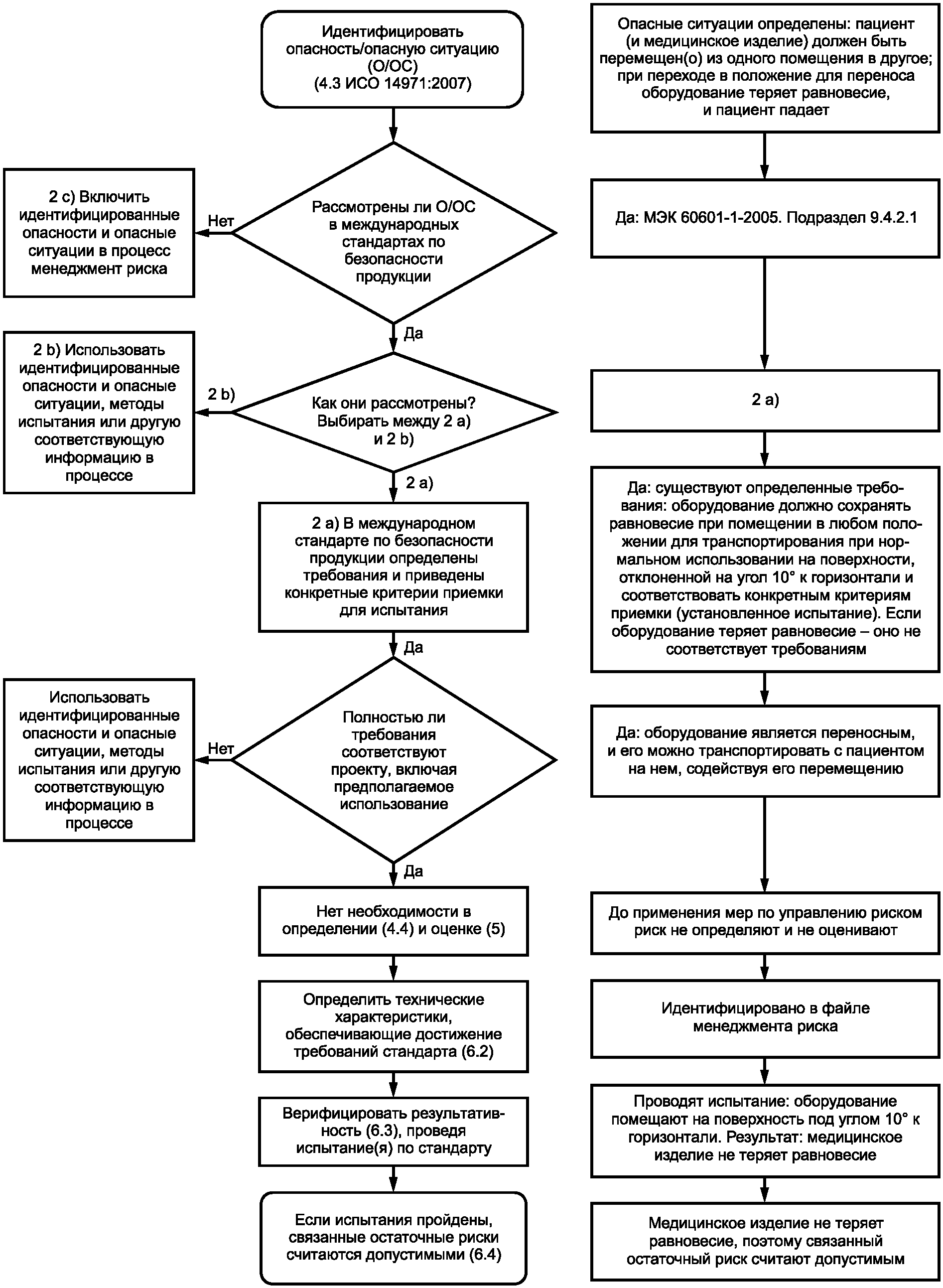 b) Если в международном стандарте по безопасности продукции технические требования и связанные с ними испытания, а также критерии приемки результатов испытаний установлены не в полном объеме, то ситуация является более сложной. В некоторых случаях стандарты предписывают изготовителю проводить конкретные испытания, связанные с известными опасностями или опасными ситуациями, но не приводят критерии приемки (например, МЭК 60601-2-16, к оборудованию для гемодиализа, гемодиафильтрации и гемофильтрации). В других случаях стандарты просто указывают изготовителю на необходимость исследовать конкретные опасности или опасные ситуации в рамках анализа риска (например, 10.2 МЭК 60601-1:2005). Диапазон альтернативных вариантов слишком велик, чтобы предоставить конкретные указания по использованию таких стандартов в процессе менеджмента риска. Тем не менее изготовителям рекомендуется использовать содержание таких стандартов в их менеджменте риска конкретных медицинских изделий.