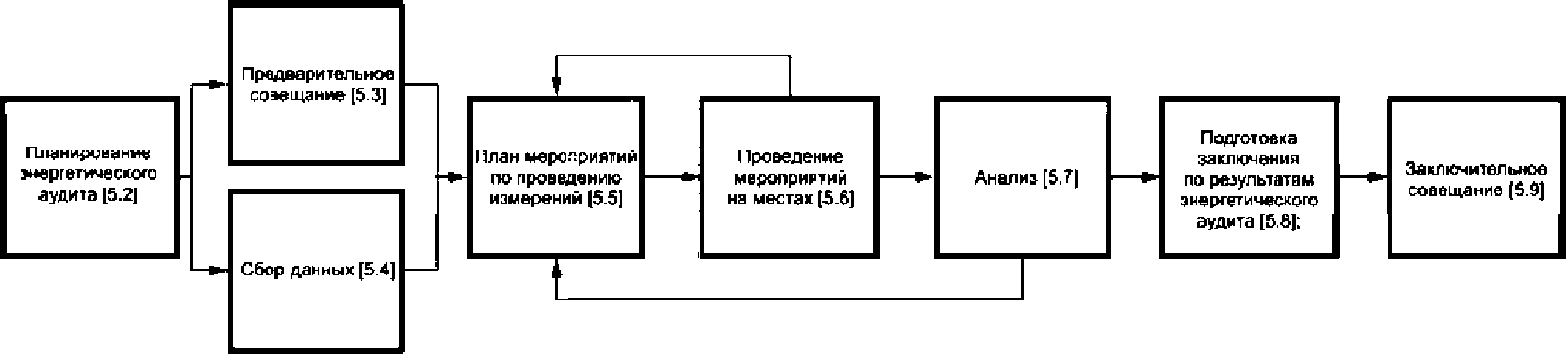 Процесс энергетического аудита представлен в виде простой хронологической последовательности, но не исключает повторения действий некоторых шагов.