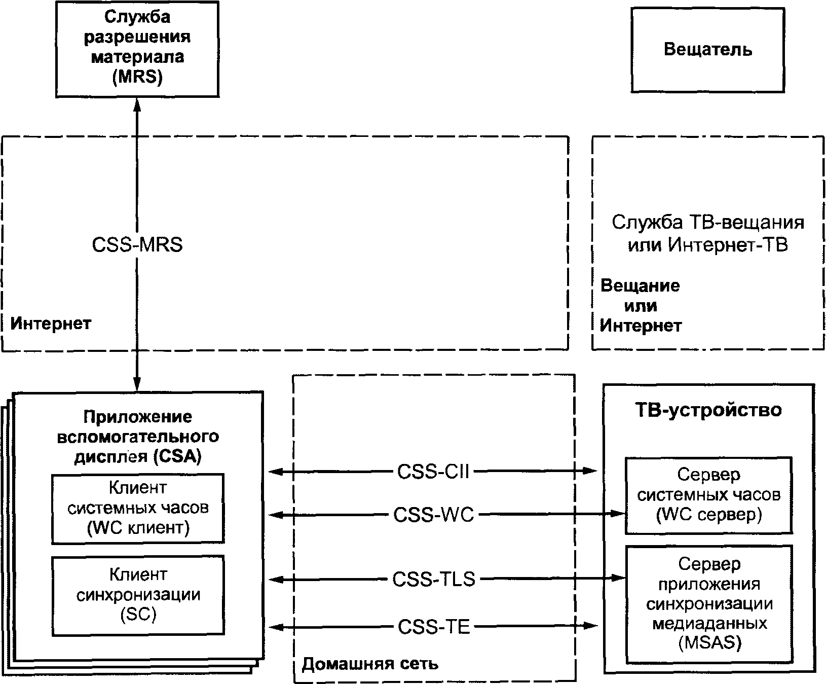 Интерфейс TLS находится между элементарной функцией MSAS (Media Synchronization Application Server; MSAS) ТВ-устройства и элементарной функцией SC (Synchronization Client; SC) приложения вспомогательного дисплея.