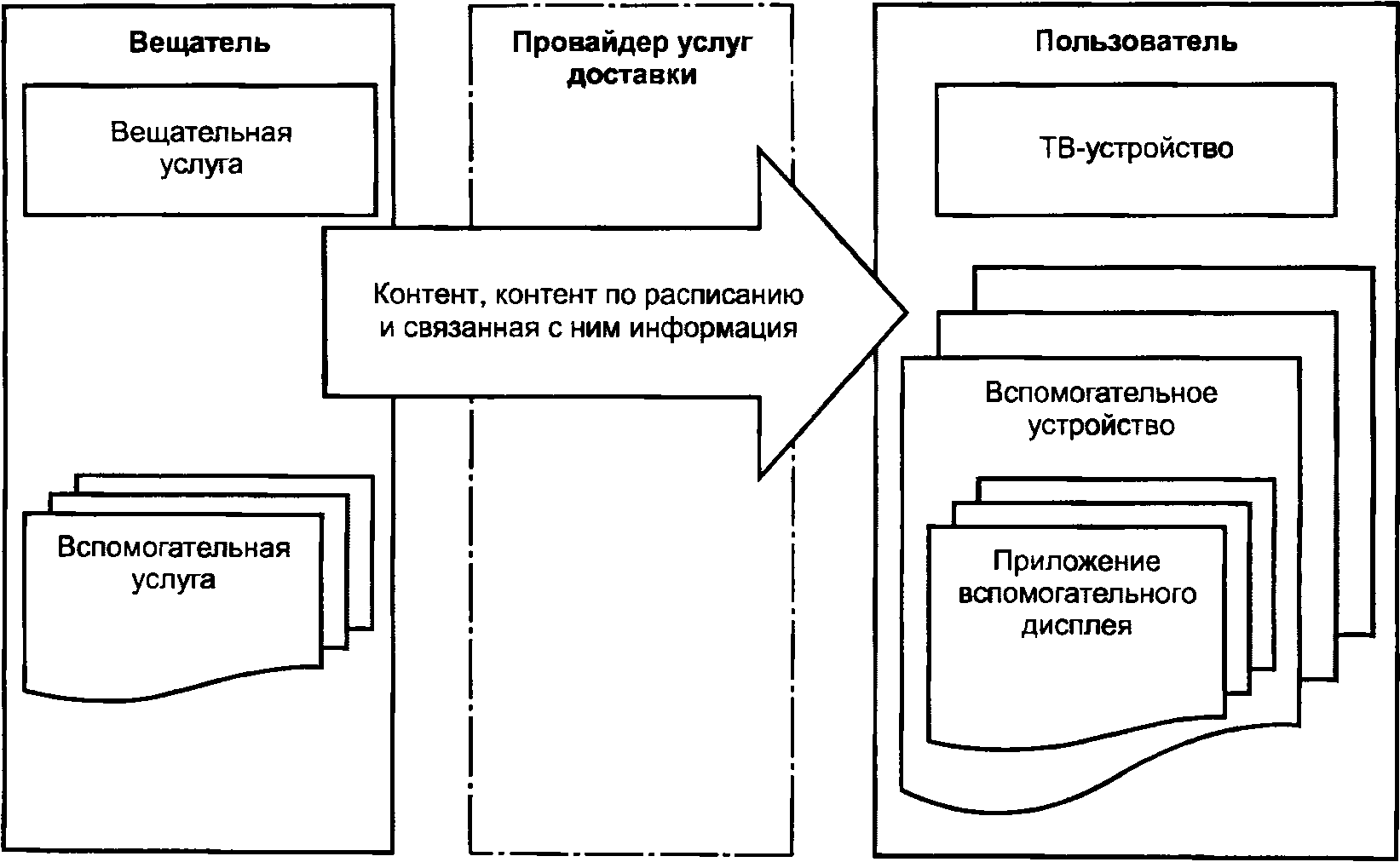 рисунке 3 показаны стандартизированные на сегодняшний день интерфейсы внутри составной поставляемой услуги, вещательный контент или контент по запросу, доставляемый на ТВ-устройство через вещательную сеть или сеть Интернет.