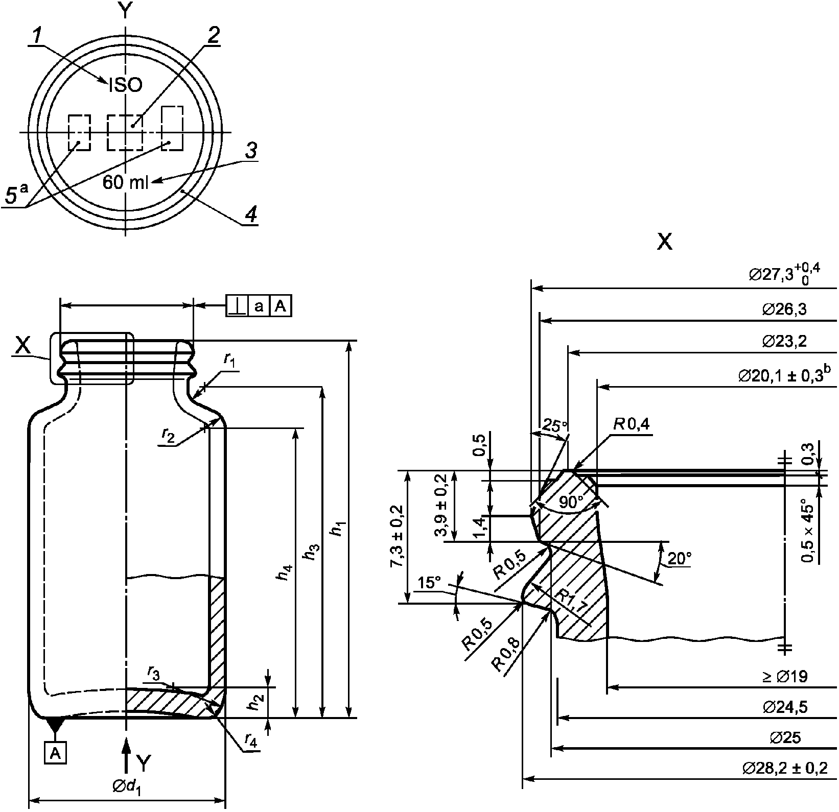 В качестве материала следует использовать бесцветное (cl) или темное (янтарное) (br) боросиликатное стекло (см. стандарт ИСО 4802-1 или ИСО 4802-2), или известково-натриевое стекло (см. стандарт ИСО 4802-1 или ИСО 4802-2), имеющее 3 (HGB 3) класс гидролитической стойкости согласно ИСО 719 или 2 (HGA 2) класс согласно ИСО 720.
