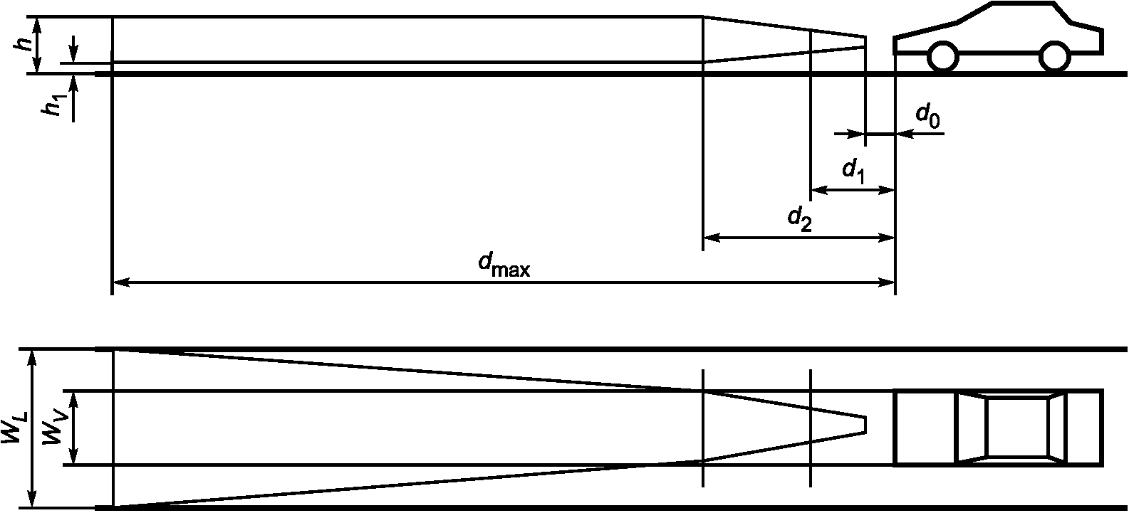 d1 - минимальное расстояние обнаружения с возможностью измерения расстояния;