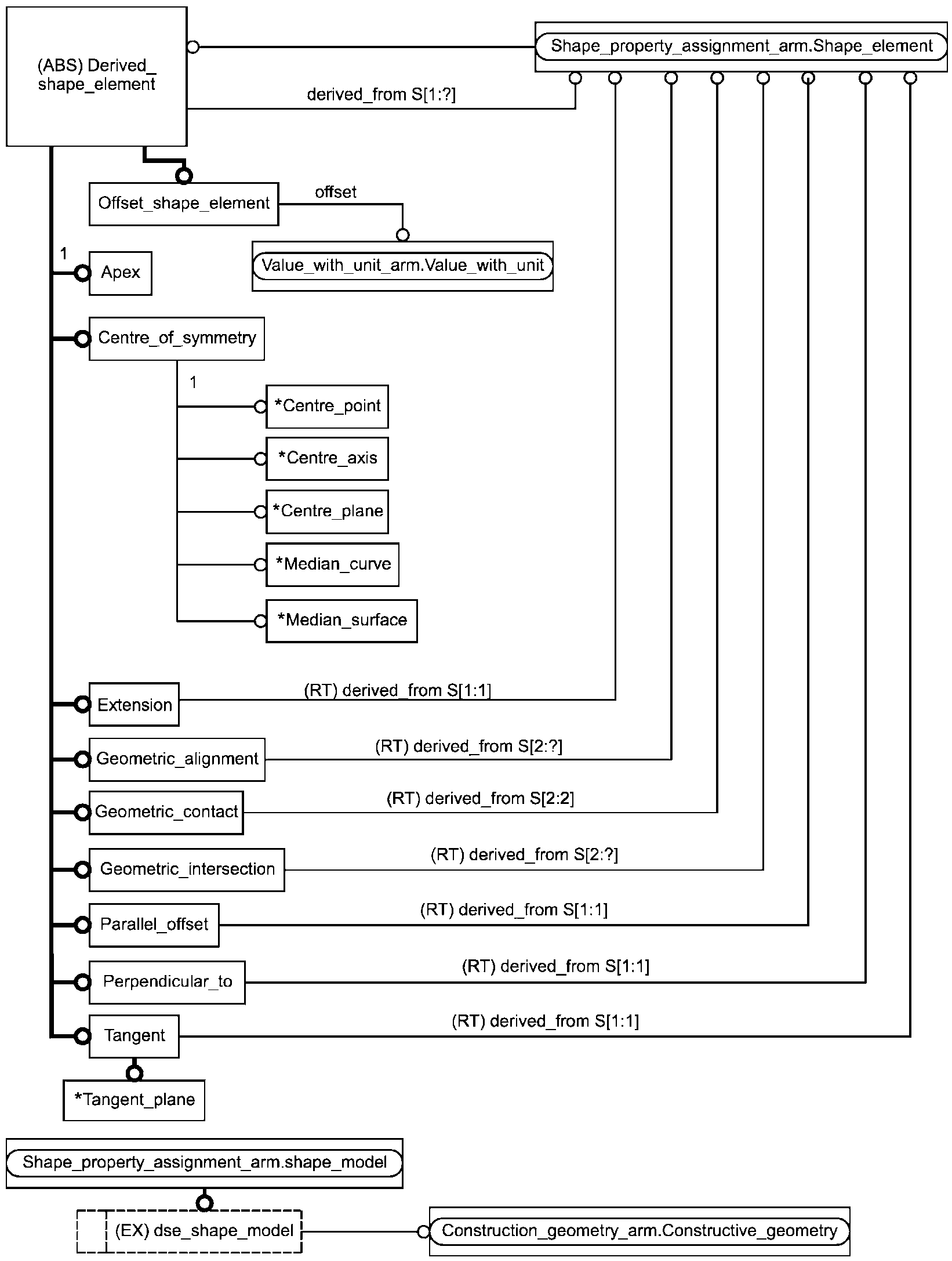 Производный элемент формы имеет отношение "выведено из" с другим элементом формы. Отношение "выведено из" может существовать между элементами, используемыми для спецификации и верификации геометрических размеров и допусков, задаваемых в качестве требований к форме изделия.