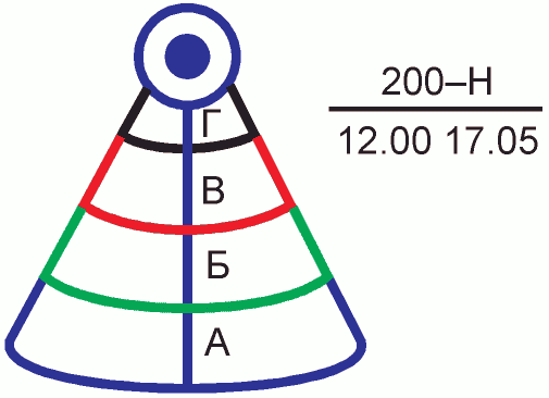 Прогнозируемые зоны радиоактивного заражения: А - зона умеренного заражения; Б - зона сильного заражения; В - зона опасного заражения; Г - зона чрезвычайно опасного заражения. Ось зоны наносится по направлению среднего ветра, боковые границы касательные к окружности зоны возможного заражения в районе взрыва, - под углом 20° к оси зоны); в числителе: 200 - мощность, кт, Н - вид взрыва; в знаменателе - время и дата взрыва | ![]() | + | + | + | + | Площадный | 1 Площадь зоны 2 Количество людей 3 Количество зданий 4 Относительная высота | 000033 |