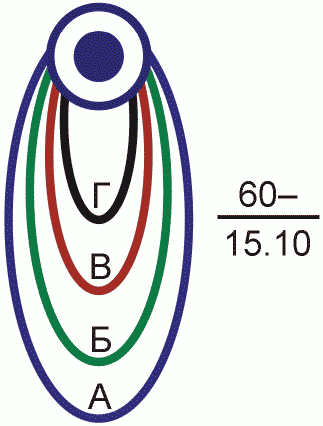 Зоны радиоактивного заражения по данным разведки: А - зона умеренного заражения; Б - зона сильного заражения; В - зона опасного заражения; Г - зона чрезвычайно опасного заражения; в числителе: 60 - мощность, кт, Н - вид взрыва; в знаменателе: время и дата взрыва | ![]() | + | + | + | + | Площадный | 1 Площадь зоны 2 Количество людей 3 Количество зданий 4 Относительная высота | 000032 |