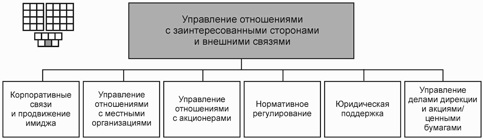 | Управление отношениями с местными организациями (Community relations management) | Процессы позиционирования организации в местном сообществе населенного пункта, где организация осуществляет свою деятельность. Процессы финансовой поддержки школ, библиотек, больниц, экстренных служб, а также поддержки окружающей среды и мониторинга местных событий. Процессы передачи необходимых сообщений об организации местным организациям, а также своим сотрудникам. Процессы взаимодействия с группами клиентов по интересам и с представителями клиентов. Процессы установления связей с общественностью и отношений с местными организациями |