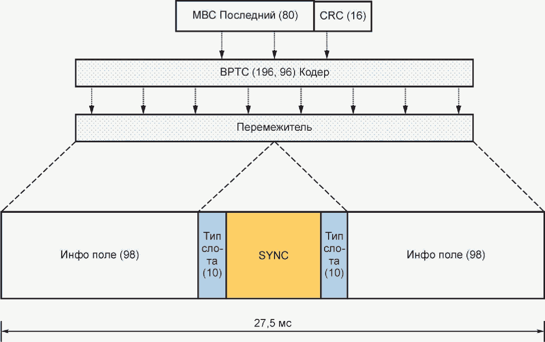Каждый отдельный голосовой вызов может быть окончен передачей пакета, содержащего данные SYNC, непосредственно после последнего голосового пакета. 72 бита LC информации защищены 24 битами CRC и BPTC корректирующим кодом. Как показано на рисунке А.23, перед BPTC (196,96) кодером применяется маска CRC соответствующего Типа Данных. Поле Типа Данных в поле Тип Слота должно быть установлено на "Окончание LC" (Terminator LC).