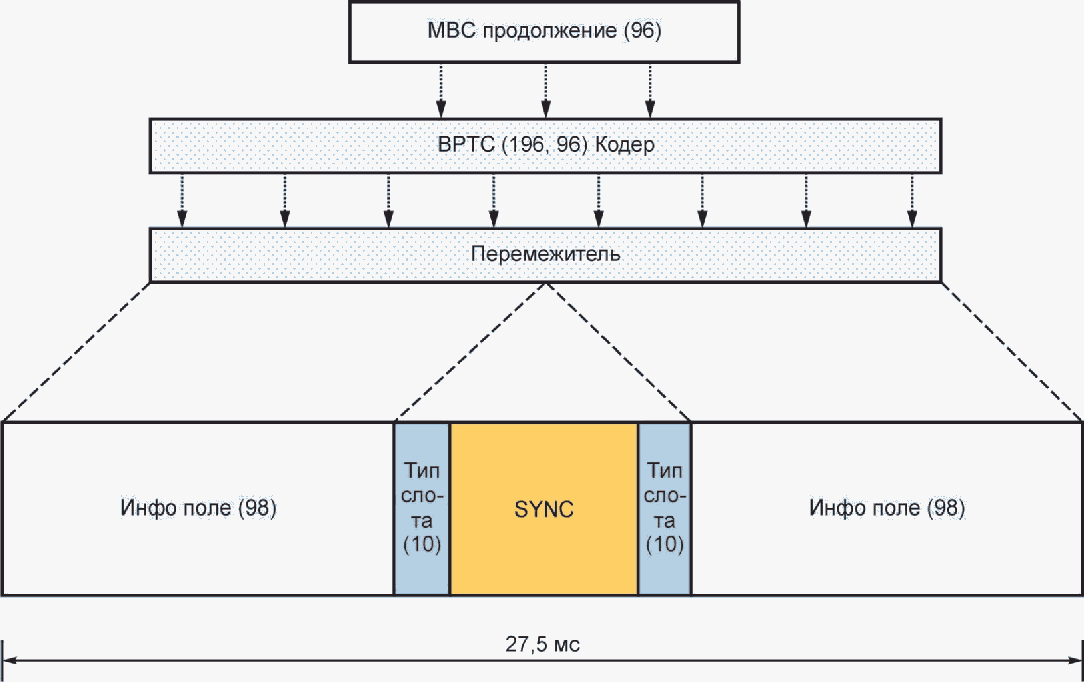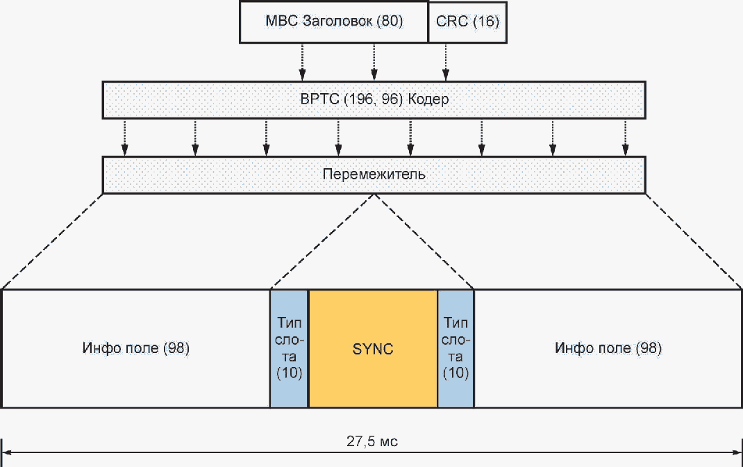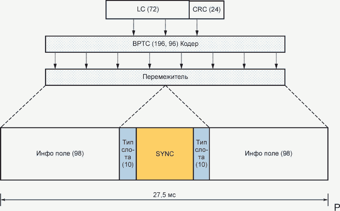 На рисунке А.22 показано, как 72-битовое LC поле с 24-битовым CRC переносится одним общим пакетом данных. Поле Тип Данных (Data Type) в поле Тип Слота (Slot Type) должно быть установлено на "Голосовой LC заголовок".