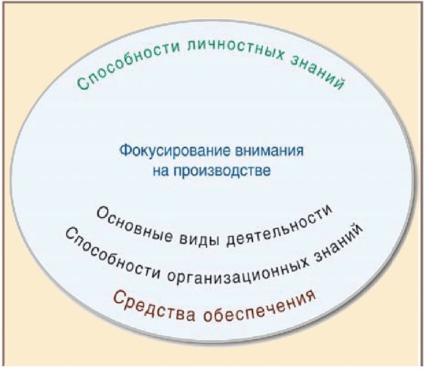1) Фокусирование внимания на производственной деятельности должно быть центром любой инициативы в области менеджмента знаний и представлять собой дополнительную значимость организации, которая может, как правило, включать разработку стратегии, инновацию продукта (услуги) и разработку, производство и доставку услуги, поддержку реализации продукции и потребителей. Эти процессы представляют собой внутренний организационный контекст, в котором создается и применяется знание о продуктах и услугах, потребителях или технологии.