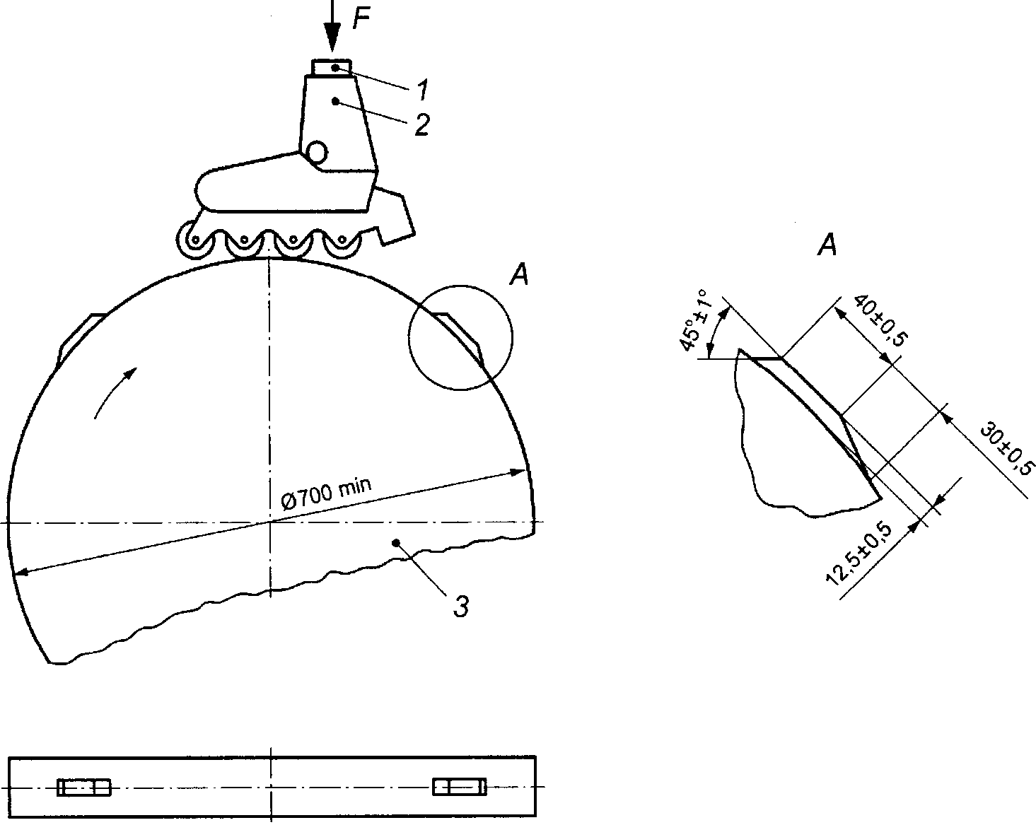 6.7.2 Испытание проводят на испытательном устройстве, обеспечивающем горизонтально направленный удар по переднему ролику, как показано на рисунке 2. Энергия удара должна быть не менее 135 Дж для роликового конька класса A и не менее 90 Дж для роликового конька класса B, скорость удара - (4,5 +/- 0,5) м/с для роликового конька класса A и (3,75 +/- 0,40) м/с для роликового конька класса B.