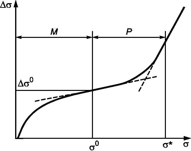 M - область микропластической деформации, в которой зависимость глубины релаксации от напряжения описывается выпуклой кривой с уменьшающейся производной