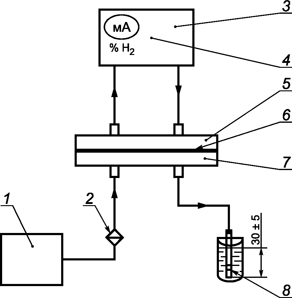Испытания образцов проводят на техническом устройстве по определению водородопроницаемости пленочного текстиля типа приборов "ПВПТ", изображенного на рисунке 2.