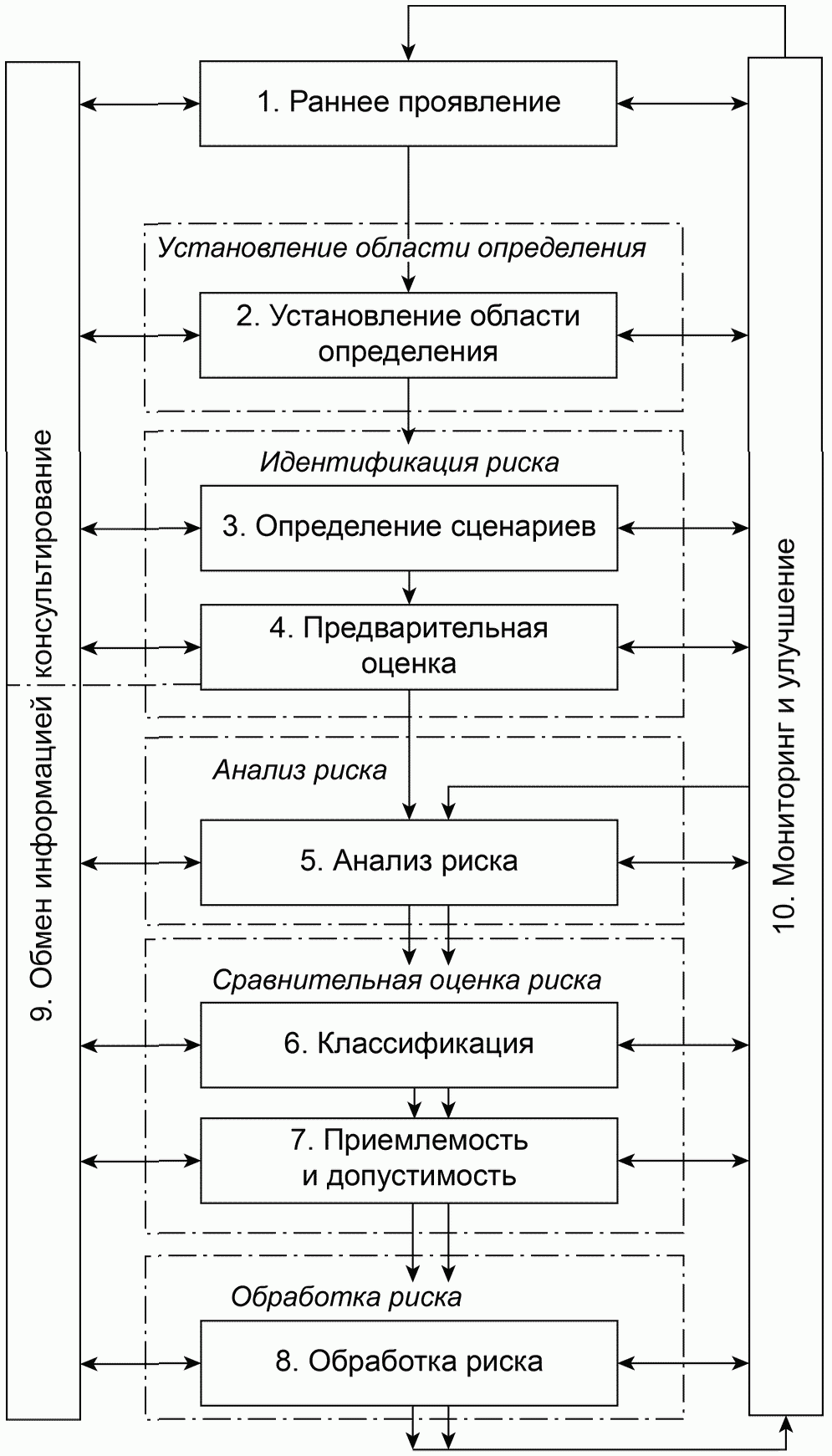 10 Мониторинг и улучшение | Информация, полученная на всех этапах; информация о возможном снижении риска, как результат информирования о риске | Непрерывное наблюдение и постоянный анализ | Контроль риска, контроль условий, влияющих на риск, анализ менеджмента | Недостаточно внимательный контроль, недостаточно чувствительный к изменениям контроль; недостаточный контроль за деятельностью по обработке риска |