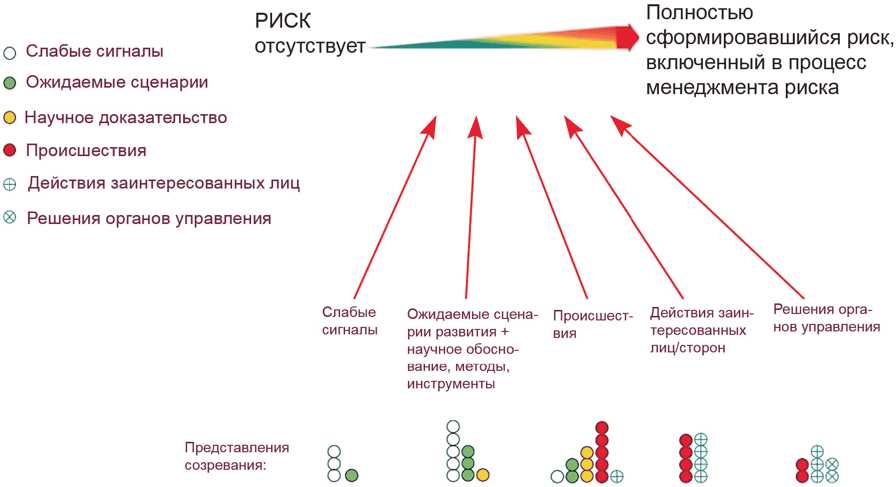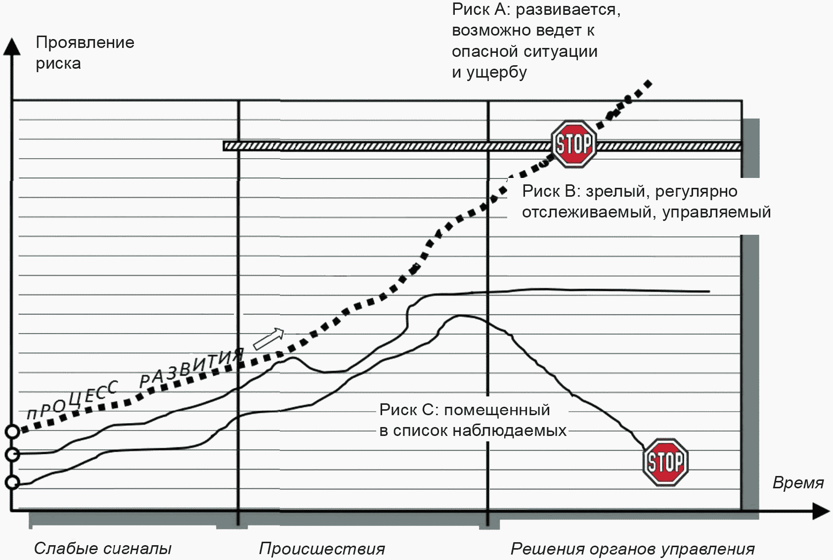 3.30 развитие риска (risk maturation): Процесс, начинающийся с появления ранних предупреждений, слабых сигналов, накопления свидетельств о проявлении риска и заканчивающийся признанием наличия риска.