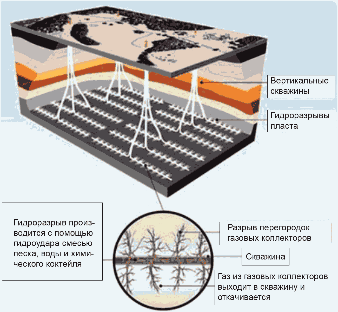 Ввиду низкой проницаемости газоносных пластов при добыче нетрадиционного газа на одну пробуренную скважину приходится меньшее количество добываемого газа, что является причиной более плотного расположения буровых скважин, чем при добыче традиционного газа. Часто требуется применение дорогостоящего горизонтального бурения, использование специальных буровых растворов и технологий гидроразрыва пласта (см. рисунок 4).