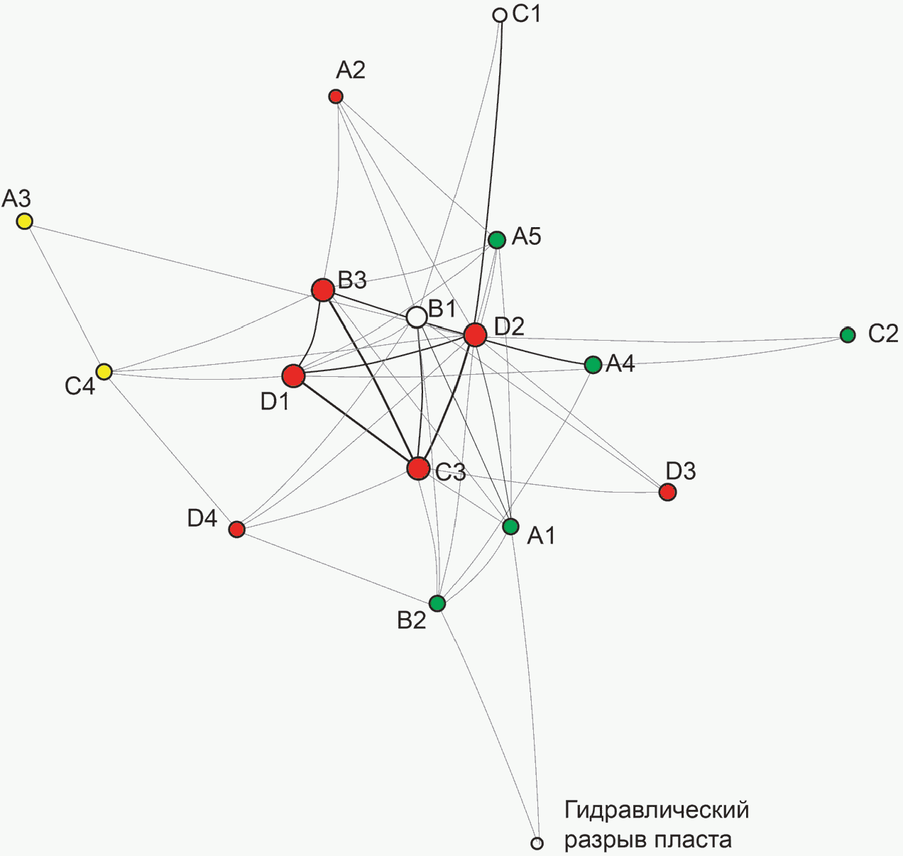 Пример - Результаты анализа представлены на рисунке 1. При применении анализа данных методом S-RDI использован алгоритм кластеризации с одиночной связью (подобные алгоритмы считают минимум из возможных расстояний между парами объектов, находящимися в одном кластере). По представленному на рисунке графу видно, что метод добычи нетрадиционного газа при помощи гидравлического разрыва пласта имеет сильную связь с двумя видами рисков: B2 и A1.