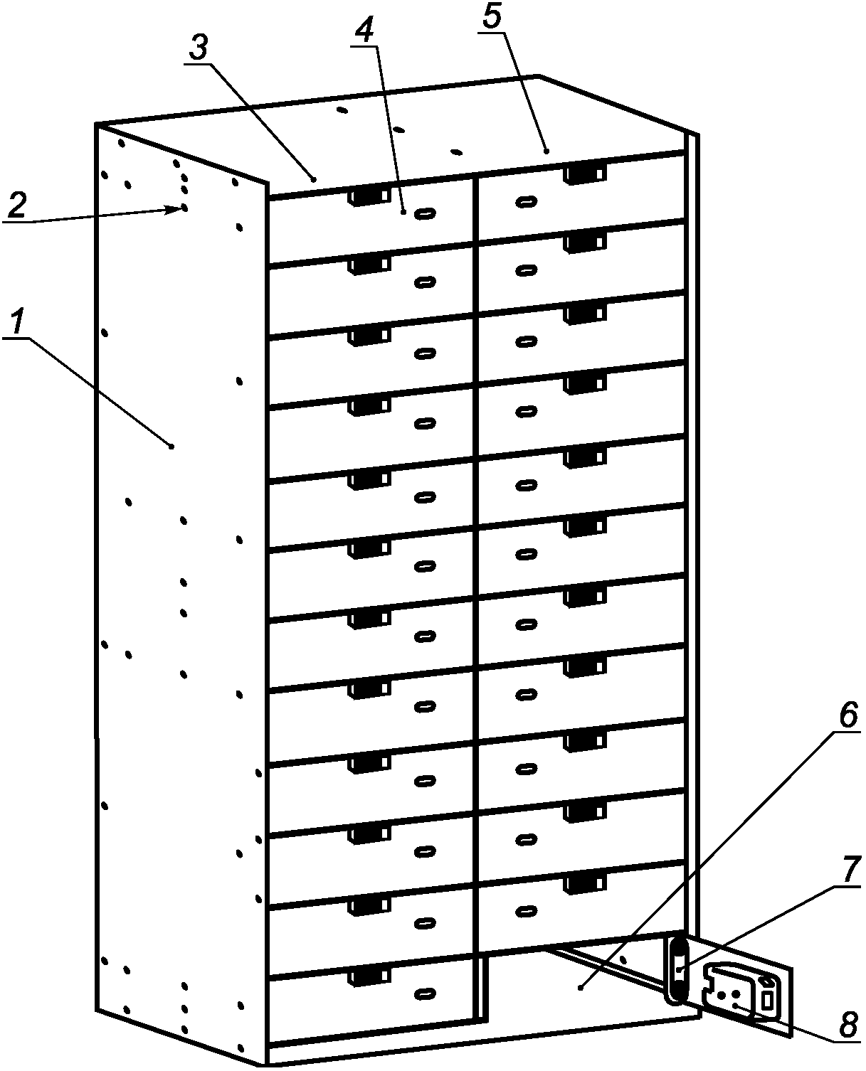 3.2 стойка депозитных ячеек (депозитная стойка): Конструкция, состоящая из набора депозитных ячеек, расположенных одна над другой в вертикальный ряд.