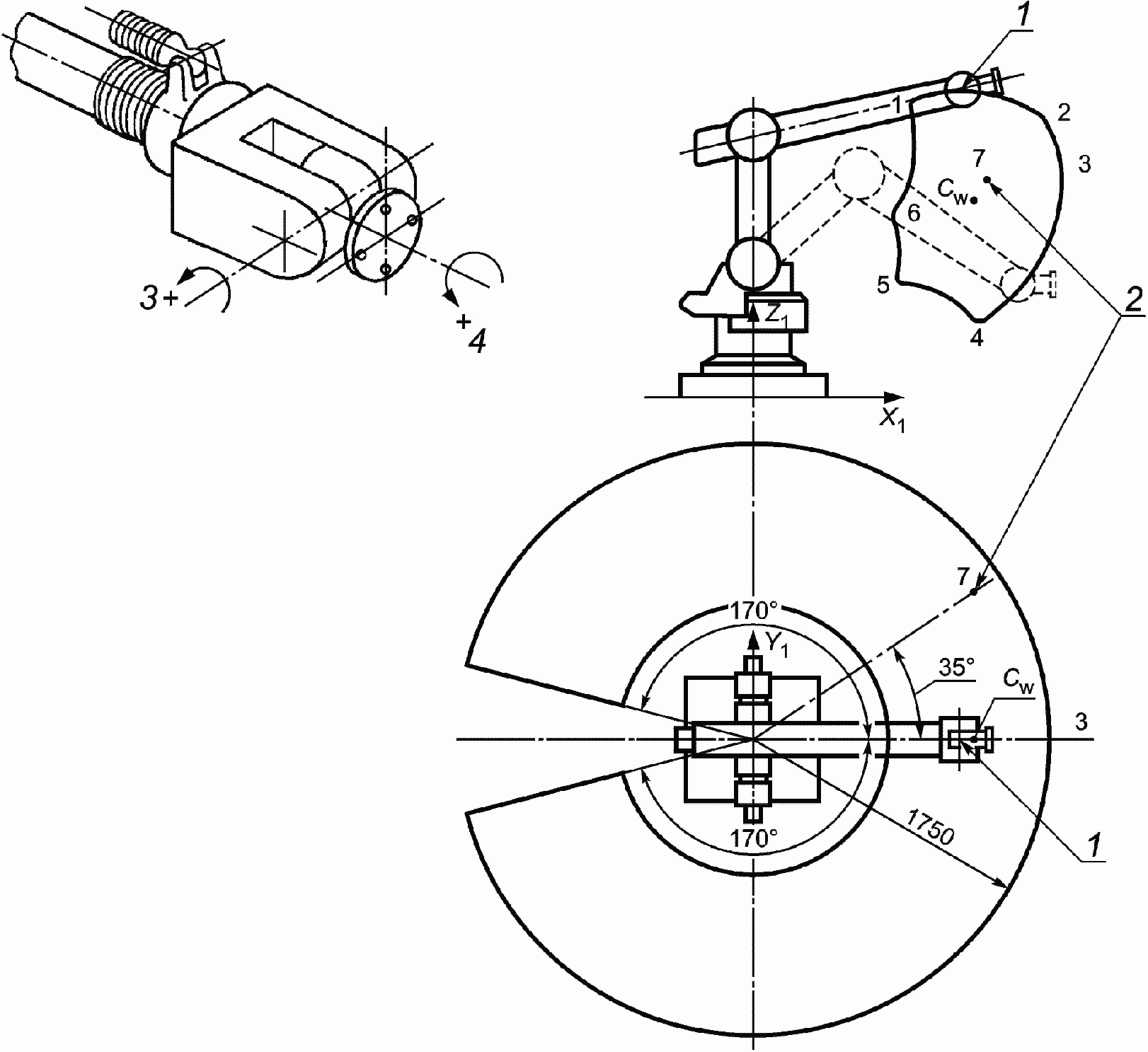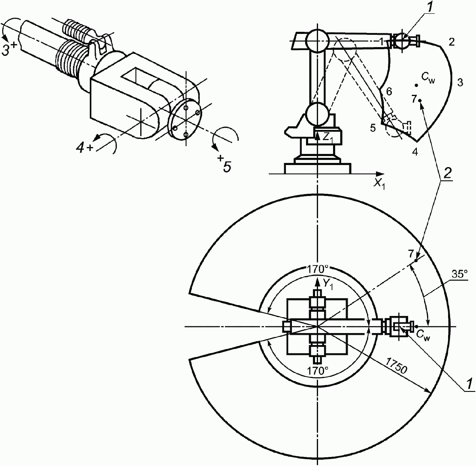 Cw), должны быть показаны на чертеже, по крайней мере, с двумя видами [один из видов представляет проекцию геометрического места точек, максимально достижимых манипулятором робота, на плоскость