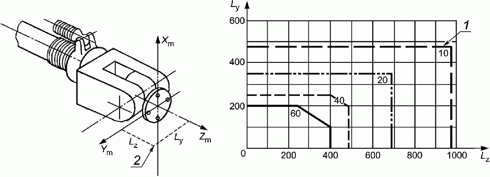 Рекомендуется, чтобы параметры рабочей зоны и диапазоны перемещения вторичных степеней подвижности были приведены на данном чертеже в табличной форме, как показано на