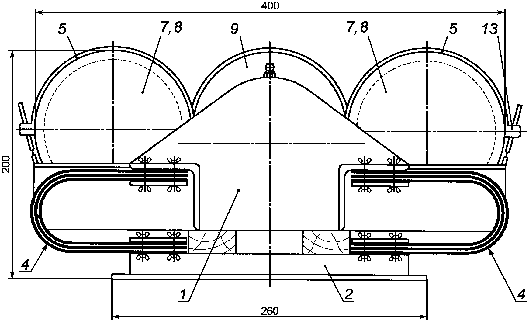 Мельница (1) и приводной двигатель (9) смонтированы на общей фундаментной плите (2). Барабаны (7, 8) устанавливают в корпус мельницы, который поддерживают четыре плоских пружины (4). Система обеспечивает работу мельницы без креплений болтами и анкеровки барабанов. Барабаны крепят с помощью регулируемых ремней (5) с фиксаторами (13). Вибратор поддерживается подшипником (6), смонтированным с корпусом мельницы, приводится в движение от электродвигателя (9) через специальную муфту (3) и гибкий вал (12). Амплитуда вибрации - (4 +/- 0,5) мм.