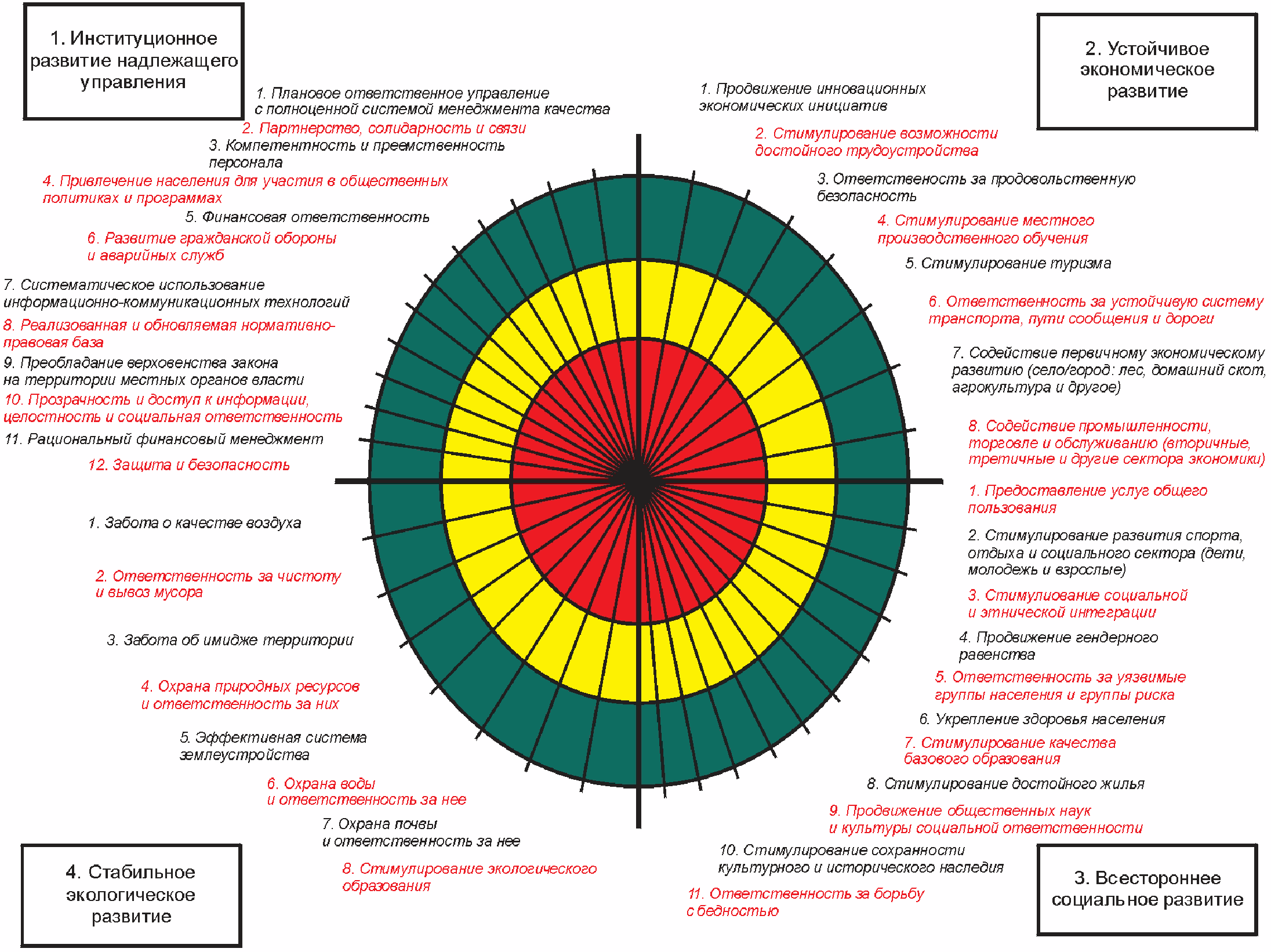 6 Ответственность за устойчивую систему транспорта, пути сообщения и дороги | Недостаточно городских, междугородных и внешних транспортных сообщений, а кроме того территория местных органов власти не имеет достаточно дорог, соединяющих ее с территориями других местных органов власти | Достаточное количество городских и внешних транспортных сообщений с необходимыми базовыми структурами недостаточно пригодны и отвечают интересам всех граждан. Территория местных органов власти имеет дороги, соединяющие ее с территориями других местных органов власти, но они недоступны или небезопасны | Имеются городские, междугородные и внешние транспортные сообщения с необходимыми базовыми структурами, пригодные и отвечающие интересам всех граждан. Территория местных органов власти имеет достаточное количество дорог, которые служат ее доступному и безопасному сообщению с территориями других местных органов власти |