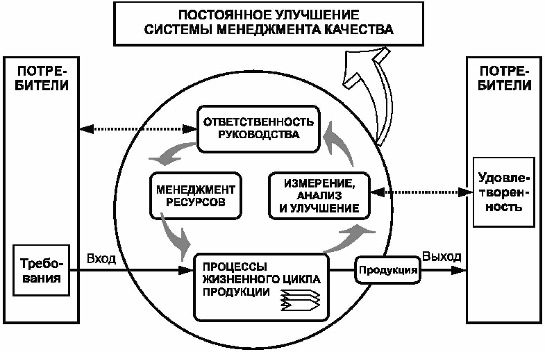ISO 9001-2008 Системы менеджмента качества. Требования Введение 0.2 Процессный подход Настоящий стандарт направлен на применение процессного подхода при разработке, внедрении и улучшении результативности системы менеджмента качества в целях повышения удовлетворенности потребителей путем выполнения их требований. Для успешного функционирования организация должна определить и осуществить менеджмент многочисленных взаимосвязанных видов своей деятельности. Деятельность, использующую ресурсы и управляемую в целях преобразования входов в выходы, можно рассматривать как процесс. Часто выход одного процесса образует непосредственно вход следующего. Применение в организации системы процессов наряду с их идентификацией и взаимодействием, а также менеджмент процессов, направленный на получение желаемого результата, могут быть определены как процессный подход. Преимущество процессного подхода состоит в непрерывности управления, которое он обеспечивает на стыке отдельных процессов в рамках их системы, а также при их комбинации и взаимодействии. При применении в системе менеджмента качества такой подход подчеркивает важность: a) понимания и выполнения требований; b) необходимости рассмотрения процессов с точки зрения добавляемой ими ценности; c) достижения запланированных результатов выполнения процессов и обеспечения их результативности; d) постоянного улучшения процессов, основанного на объективном измерении. Приведенная на рисунке 1 модель системы менеджмента качества, основанная на процессном подходе, иллюстрирует связи между процессами, представленными в разделах 4 - 8. Эта модель показывает, что потребители играют существенную роль в установлении требований, рассматриваемых в качестве входов. Мониторинг удовлетворенности потребителей требует оценки информации о восприятии потребителями выполнения их требований. Приведенная на рисунке 1 модель охватывает все основные требования настоящего стандарта, но не показывает процессы на детальном уровне. |