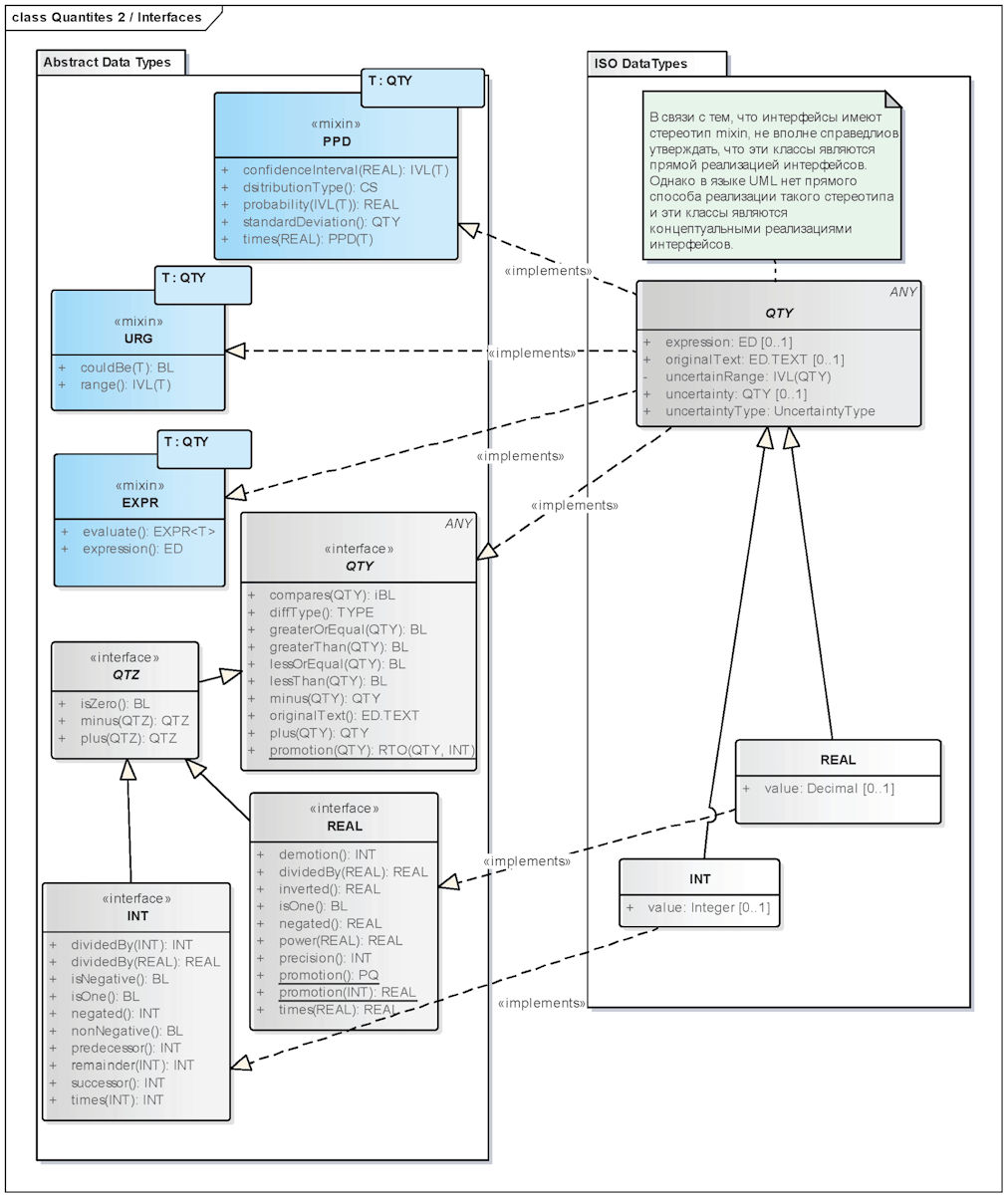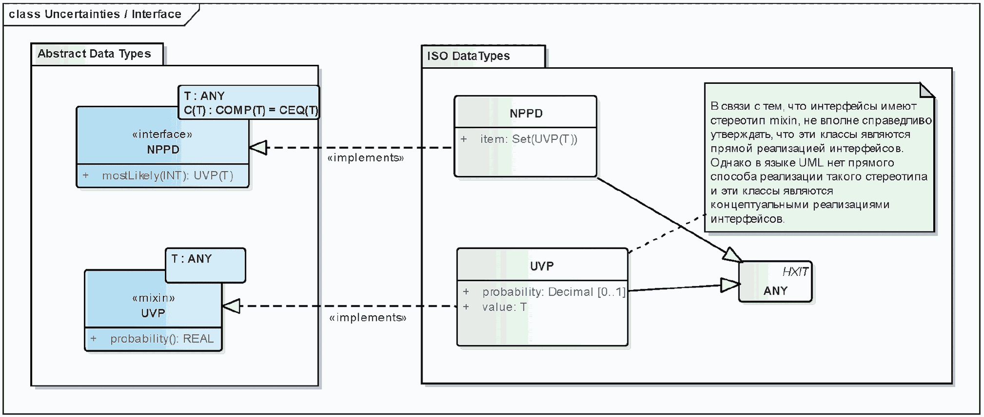 Примечание - На рисунке D.1 абстрактные типы данных представлены как интерфейсы с пользовательским стереотипом, называемым "mixin". Интерфейс с этим стереотипом похож на параметризованный интерфейс, но вместо представления свойств типа параметра такой интерфейс расширяет свойства интерфейса, являющегося его параметром. Этот метод не поддерживается во многих технологиях реализации и не имеет непосредственной поддержки в языке UML.