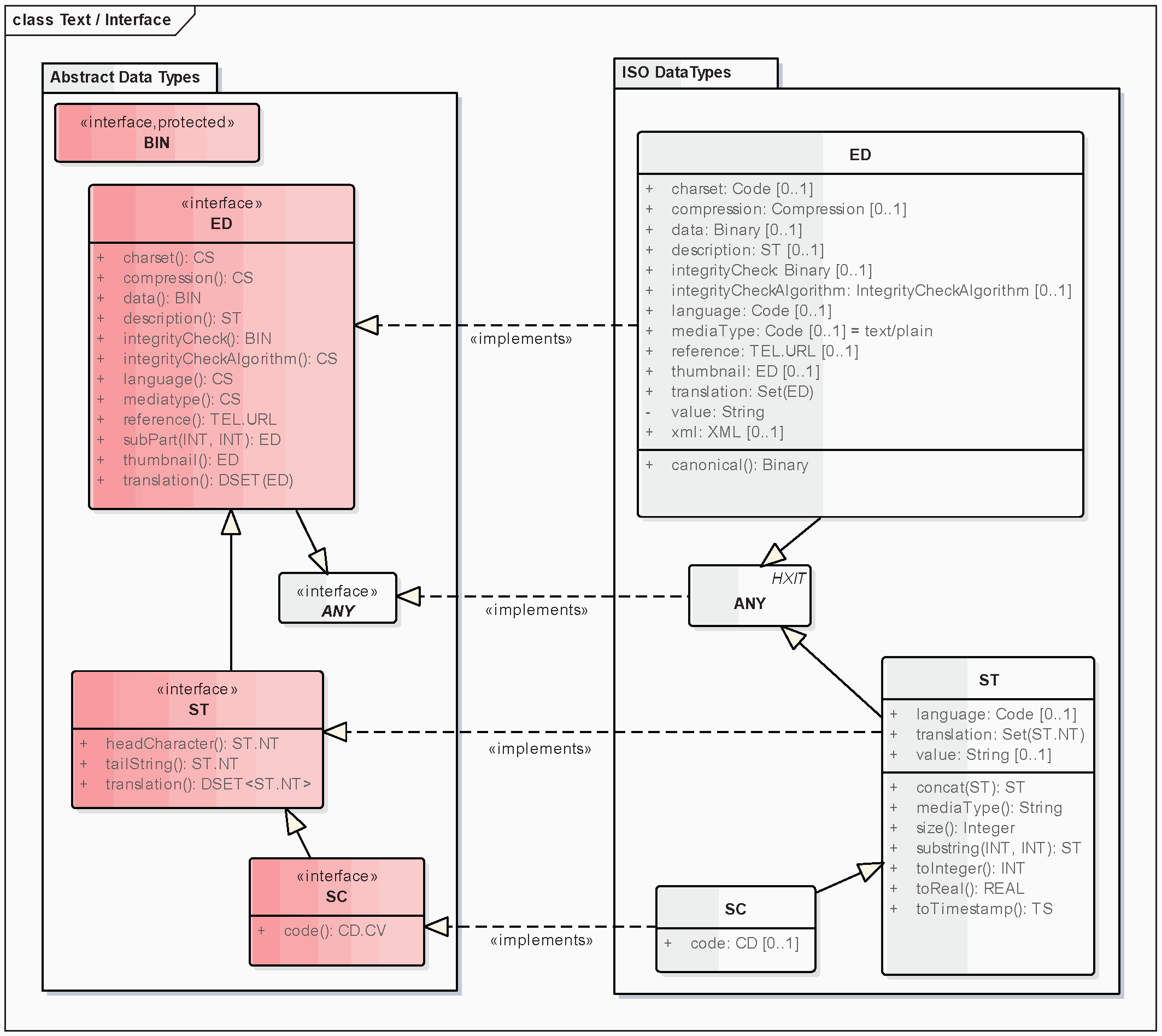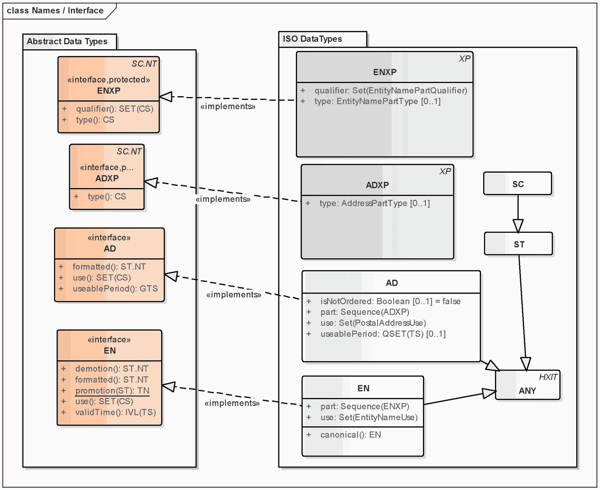 D.11 показано, как типы данных, определенные в настоящем стандарте, реализуют абстрактные типы данных, описанные в спецификации HL7 V3 Abstract Data Types.