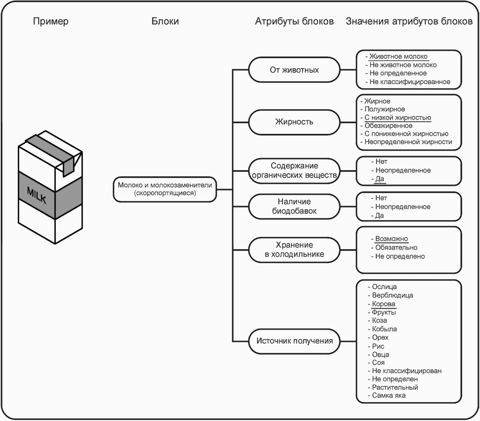 Определение блока, представленного на рисунке: "Включает в себя все продукты, которые могут иметь вкус молока или описываться как сырое молоко, полученное от таких животных, как корова, коза и буйволица, а также растительное молоко, вырабатываемое из фруктов или овощей, такое как кокосовое и миндальное молоко, либо овощные протеины типа соевого молока. Сюда же относятся продукты, химический состав которых изменен с помощью ацидофильных бактерий...".