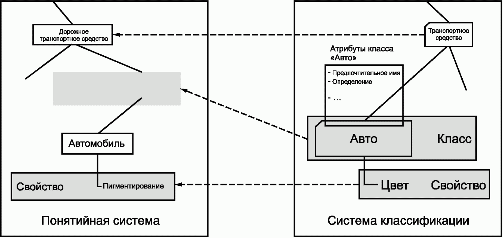 Пример - На рисунке 1 отображена взаимосвязь элементов: понятие (3.7), особенность (3.12), класс (3.4), атрибут (3.2) и свойство (3.25). Рисунок демонстрирует разделы понятийной системы (3.8), системы классификации (3.6). Класс "Автомобиль" выводится из понятия "Моторизованное средство", а свойство "Цвет" реализует признак "Пигментирование". Класс "Автомобиль" обладает такими атрибутами, как "Предпочтительное название" и "Определение". Понятие "Автомобиль" в рамках данной системы классификации не используется.