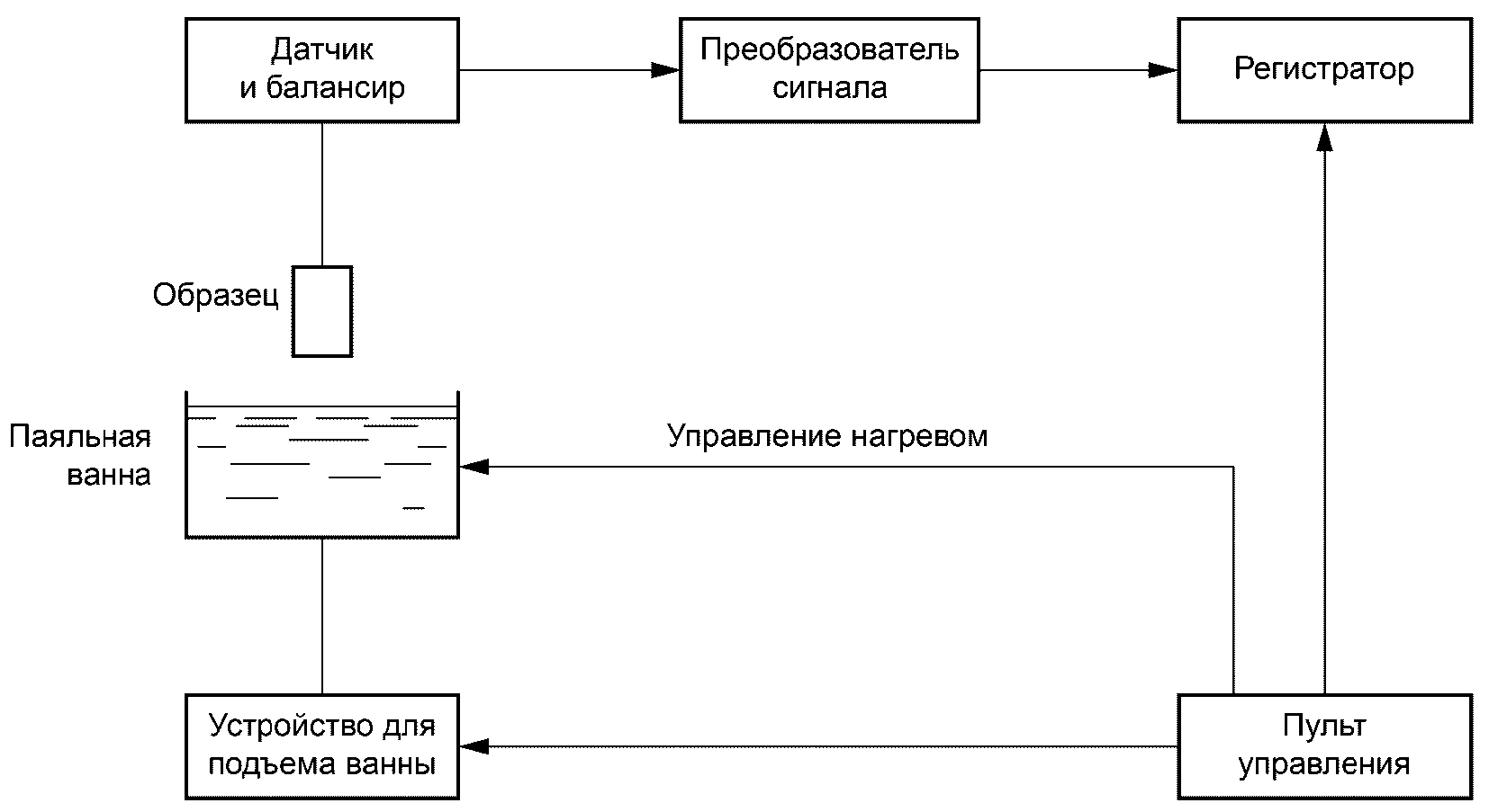 Образец подвешивают на чувствительный механический балансир (типичную пружинную систему) и погружают перпендикулярно на заданную глубину в ванну с расплавленным припоем, температуру которого контролируют. Результирующий вектор вертикальных сил баланса и поверхностного натяжения, действующих на погруженный образец, определяют с помощью датчика и преобразуют в сигнал, который непрерывно регистрируется как функция времени на регистраторе с высокой скоростью. Полученную кривую необходимо сравнивать с кривой, полученной от идеально смоченного образца такого же типа и размеров.