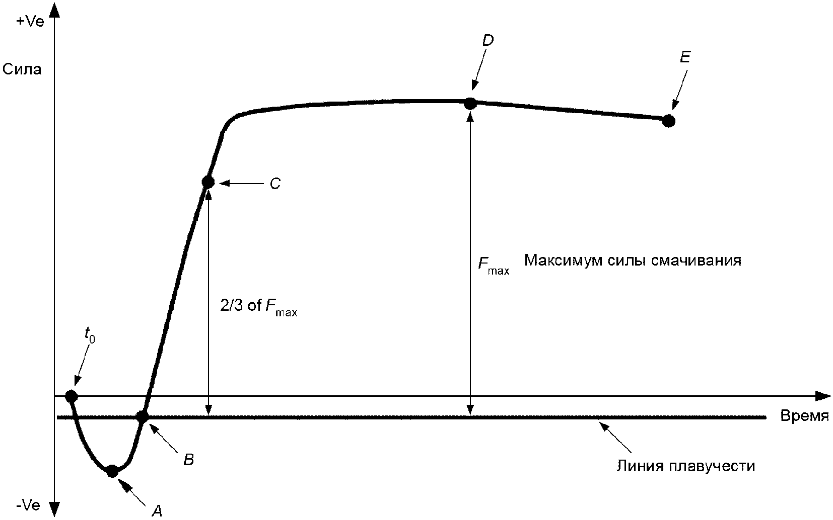 Пунктирная линия соответствует состоянию в начале испытательного цикла без учета массы образца. Сплошная горизонтальная линия показывает смещение выталкивающей силы, где сила смачивания равна 0.